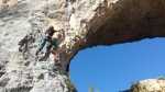 The Sierra de Guera national park lies between Huesca (where Riglos is) and Lleida (Terradets etc) and is a high plateau sluced by deep canyons. These provide the environment for the biggest pass time around here, which seems to be Canyoning, but also mega climbing venues such as Rodellar, Alquezar and Valledolid. Alquezar is a spectacular mountain village perched on cliffs above a deep gorge. The climbing is awesome, but really hard! Arriving without a guidebook we correctly guessed the easiest route but got spat off the last move. A peek at a borrowed topi confirmed a 6c+ amidst a sea of 7s and 8s. Rodellar is justifiably famous – a long, deep canyon with climbing on walls and caves along both sides. Again, much of this is really hard, but there’s one particularly photogenic sector Delfin ( meaning Dolphin) climbing either side of a natural arch. Best regards |