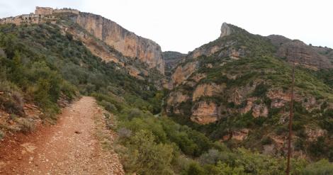 Rain – Nature’s way of telling you to have a rest day. Time to recuperate aching limbs and catch up on the household (van-hold?) chores. A trip to a decent sized supermarket (Barbastro has a “Simply” if you’re passing anytime), attend to emails and have a bit of a tidy. Because a van is smaller than a house, there’s also time for a jog around the local area – here’s some photos of Alquezar not basking in sunshine, and the amazing walkway through the gorge beneath the town. So you see – the odd rainy day really isn’t such a bad thing. … BUT it’s raining today for the second time in a week, and that’s miserable, so it’s time to leave the Sierra de Guara and Aragon and head in search of some more sunshine. |