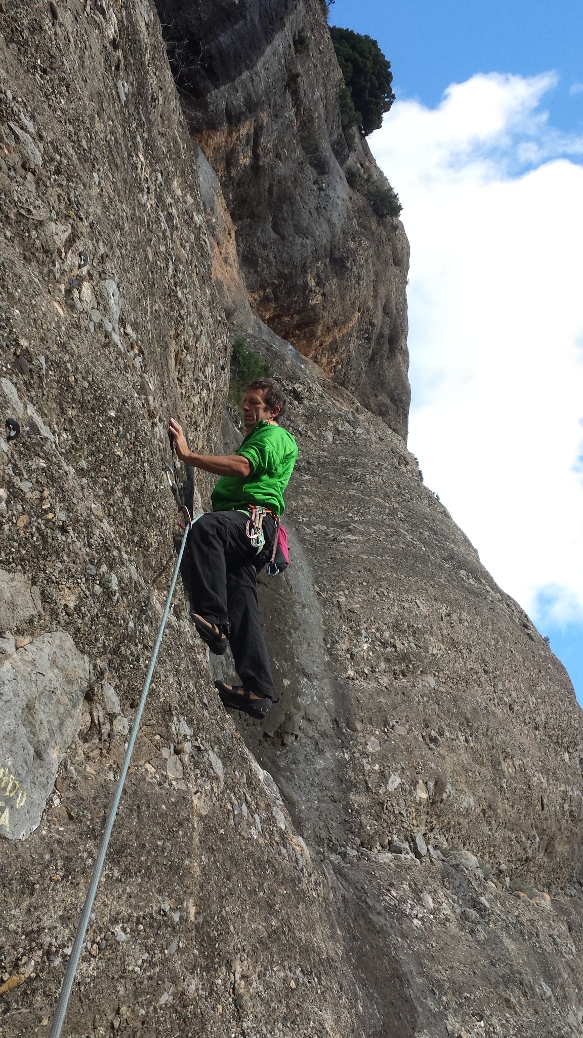 Vadiello is a major conglomerate crag, high in the Sierra de Guara. It gets the maximum 6* rating in the climbing ” bible ” for the trip – Donde Escalar, but I don’t think we caught it in great condition. A compact conglomerate means fingery climbing, which wasn’t great on a chilly damp day, so we bagged a few routes before heading back to Alquezar, where we found a more amenable sector for a sunny afternoon warm – down.