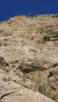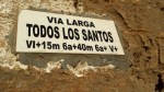 This one is in Rockfax! After yesterday’s tough day’s pulling a bit further along the hillside, we decided on a multi pitch adventure as a semi rest day. What better than the “Top 50” route Todos los Santos – a 4 pitch 6a+. Great climbing fully justified the stars, and my decision to just take our 70m rope was vindicated (but only just – see picture of top abseil) Phew! |