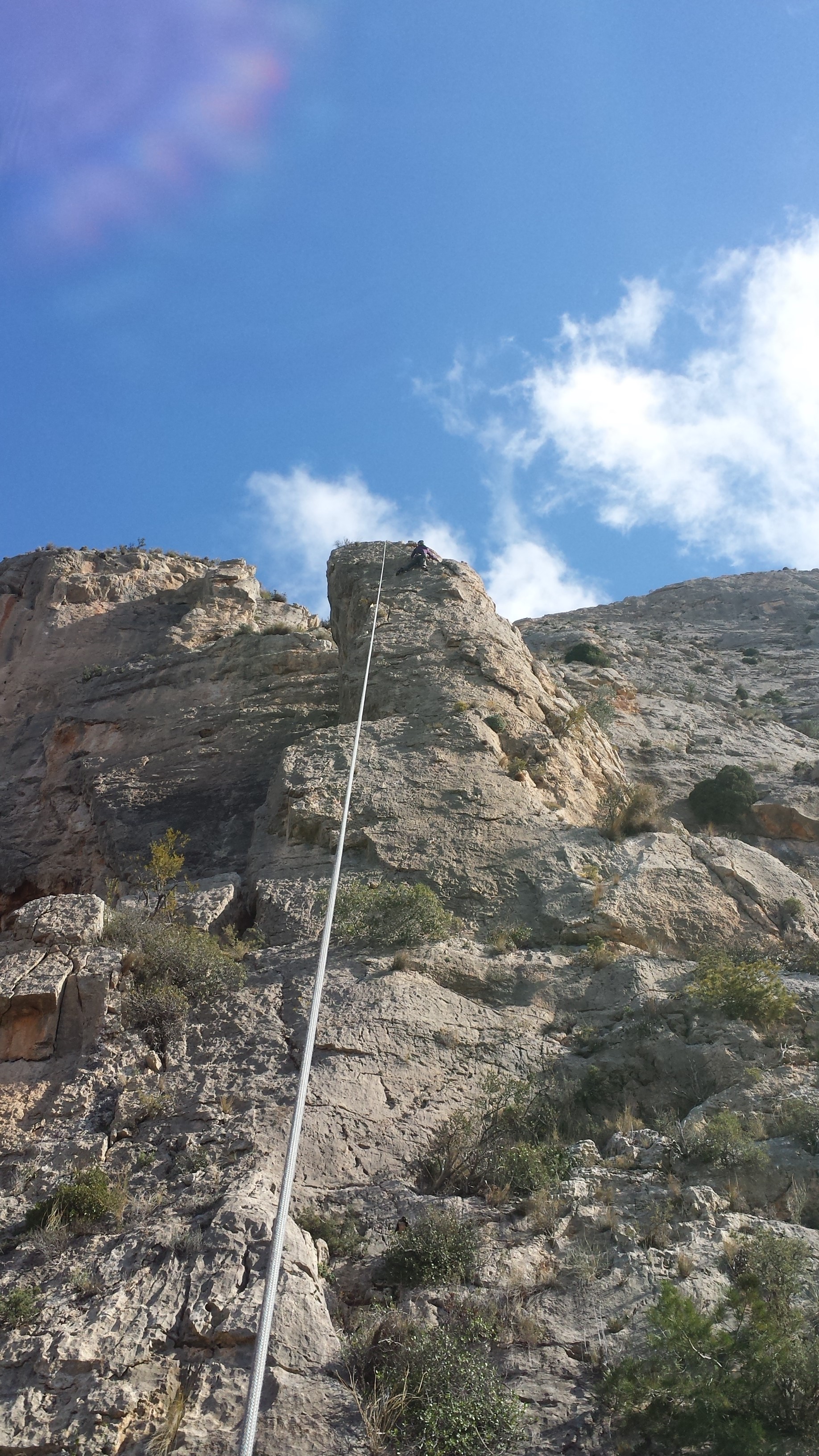 The Cabezon d’oro makes it into the top 60 crags in Donde Escalar, so we were overdue a visit. This impressive lump of rock dominates the skyline north of Alicante. The main attraction is in multi pitch routes of typically 200m to 300m, but we only had time to sample the first pitch of the excellent Delicatessen. Sadly the day was interrupted with the sad news from the villa – we’d been burgled 😦 Back at the ranch we took stock, yielding a long list of phones and tablets, together with a load of cash missing. Some very efficient local police turned up to investigate and much form filling was required down at the station. A bit of a sour note towards the end of a great trip 😦 |
