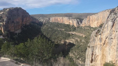 We’ve had a few days at Chulilla over the years – Smitten with the fantastic rock architecture, but never really getting much out of the climbing – many of the more manageable routes are really polished, and the grading is “old school”. However, Chulilla is now very much THE Place to Be. Huge development of new routes away from the immediate village has opened up a feast of climbing and the hordes from northern Europe (including many Brits) attest to the fame. The new guide even has a symbol for “Old School” grades to help massage bruised egos – though it would be better to just regrade the horror shows! After our dismal recce a couple of months ago, everything has changed. The sun is out, so are the crowds, and the bars are open! First stop is sector Lamentations – the huge wall that makes a backdrop to the main village crags. Awesome 35m routes on rock that’s generally just off vertical, but very sustained. Fun route of the day was Presis Crack – an appalling off width anywhere else, but a joy of relaxed bridging here, with the assurance of the shiny bolts. |