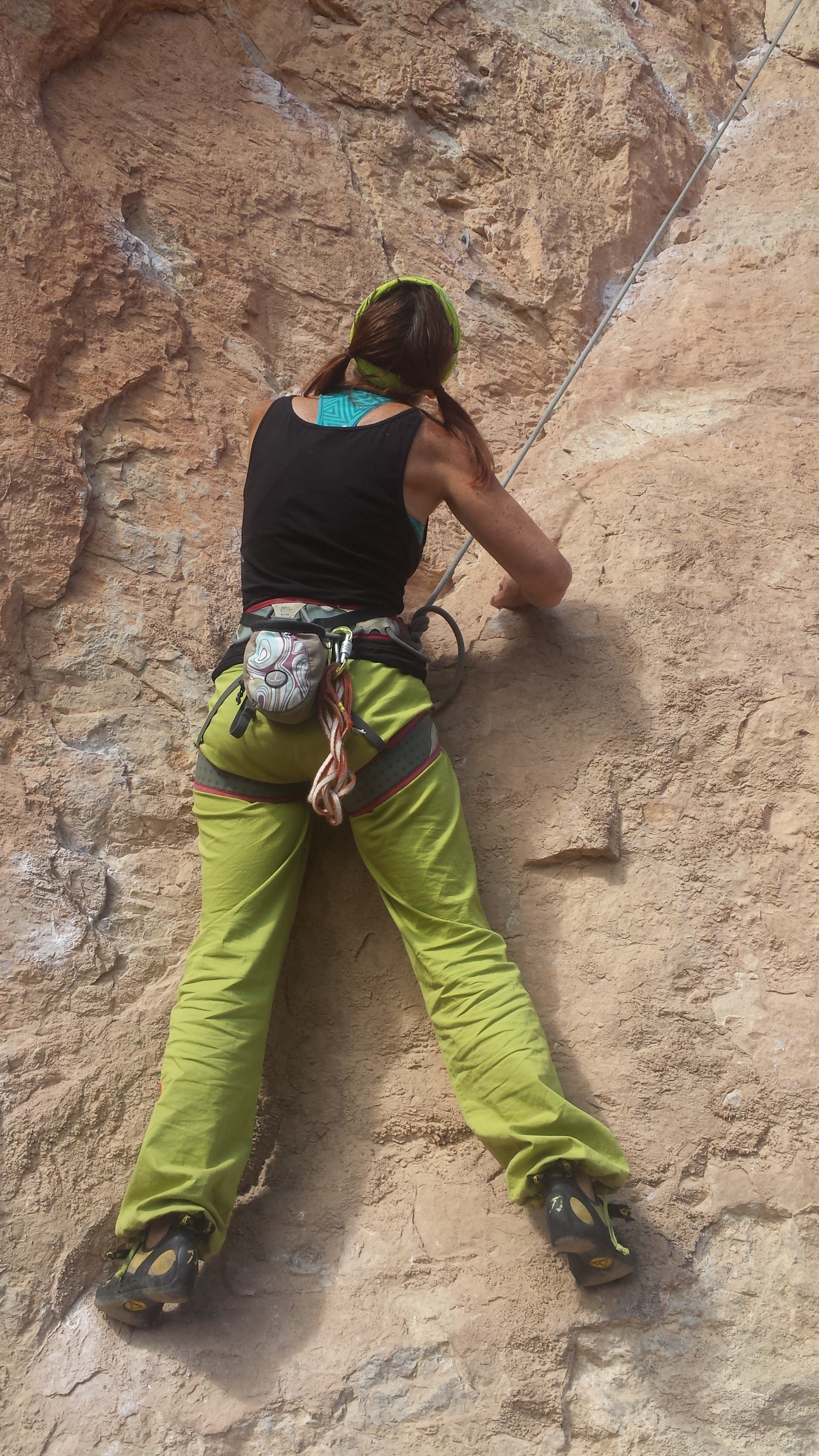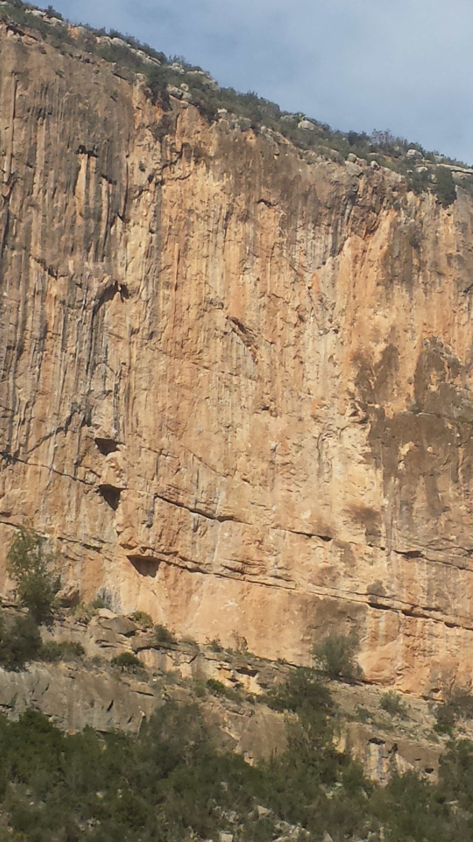 Back on the sunny side, and there’s more fantastic quality climbing to be had on PARED DE ENFRENTE. Perhaps the route of the sector is the stepped overhanging groove / crack line of Los Franceses (see picture below). A full 35m of unrelenting steepness, at 7b+ it’s somewhat out of my league for an on-sight, but I couldn’t resist a bash. 30m higher and I’m above the roofs and into tufa-territory and in sight of the chain. I’m also more pumped than I can ever remember, having already made a couple of moves I was sure I would fall off. Fingers uncurl off a jug out of pure tiredness and I’m off in to space – hey ho 😦