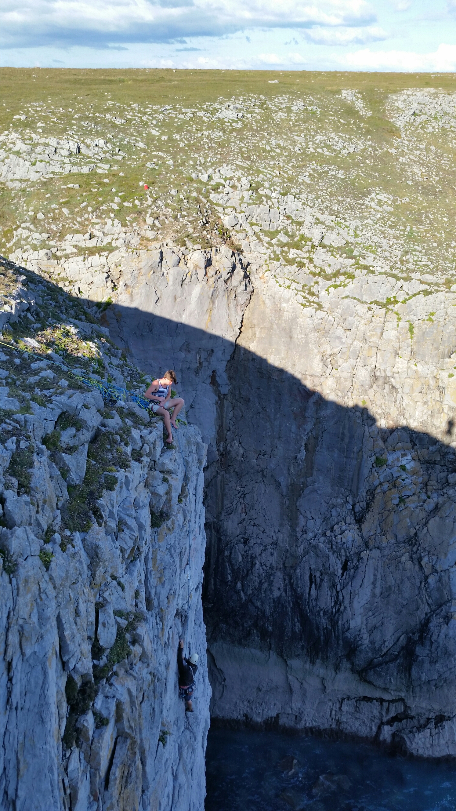 We bumped into a young German climber – Henning, on holiday with his heavily pregnant partner and their 2 year old daughter. Not surprisingly he was desperate to get some routes done at this climbing Mecca, so we invited him to team up with us for the day. Where better for a first day’s introduction to Pembroke than Huntsmans Leap.