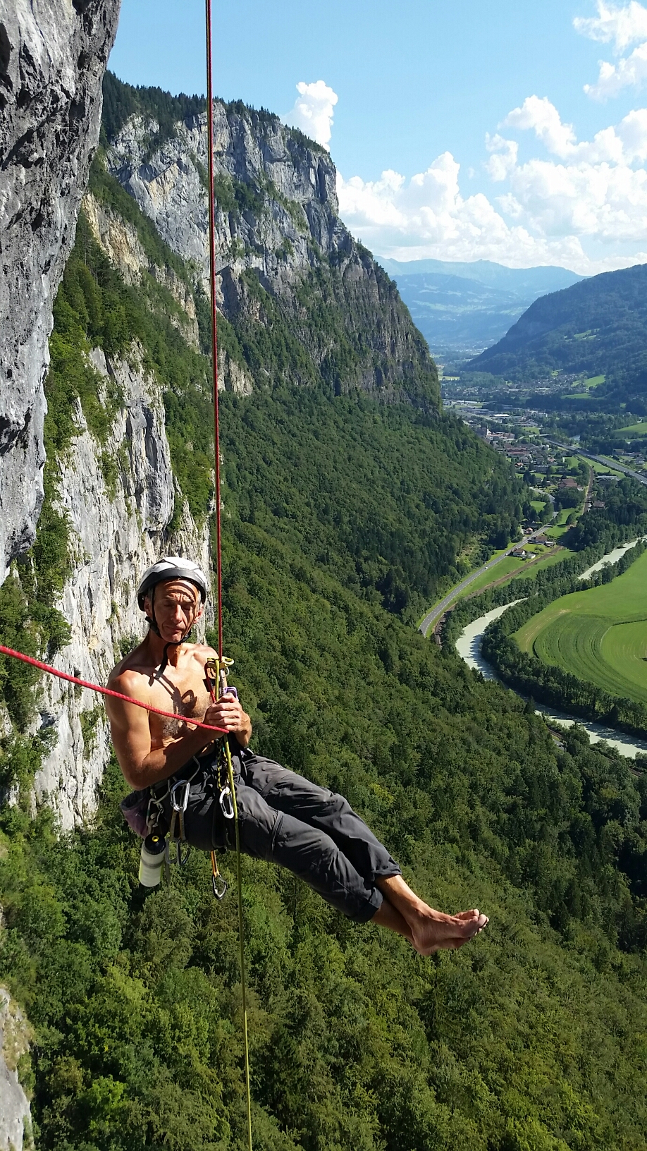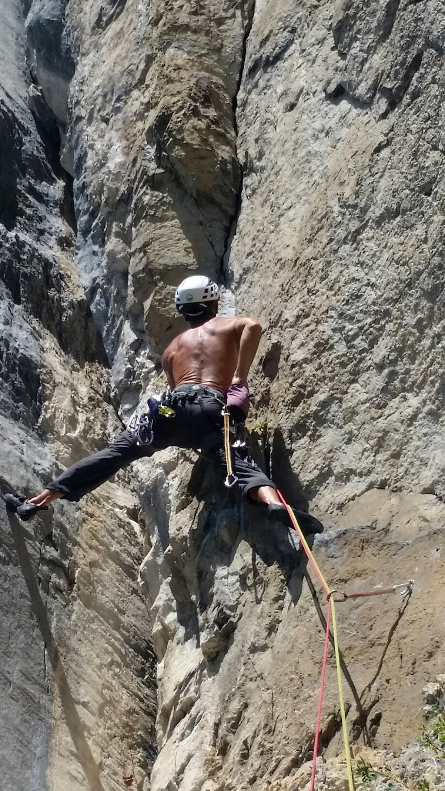 Vieux de la montagne takes the pillar, chimney and “slab” left of the huge roofs. Only 6 pitches, but the 6bs felt like 6cs, and the 6cs felt like 7as in the heat and polish. It all added up to a route too far, and turned into a fair bit of A0! My toes have never been so sore!