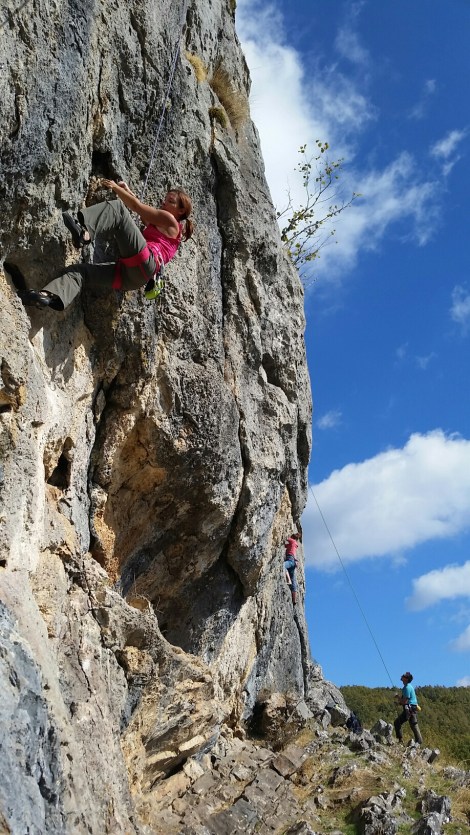 Day 2 climbing in shorts and shirtless. You take your shoes off BEFORE lowering, and then don’t even bother with a shirt for belaying. Temperature: 14C! What a difference a bit of sunshine makes!
