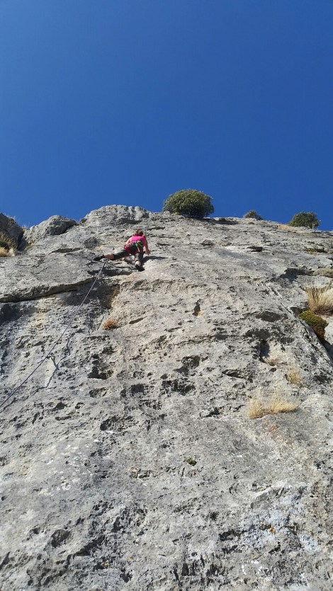 We do a few stiff, steep and somewhat polished routes at sector Medio Grado (felt tough to me, they’re rubbing it in 😉 ) then walked another few hundred metres along the crag in search of longer and less travelled routes. Sector Collado yielded an outstanding 30m 6a with a series of surprising (in a good way!) holds.