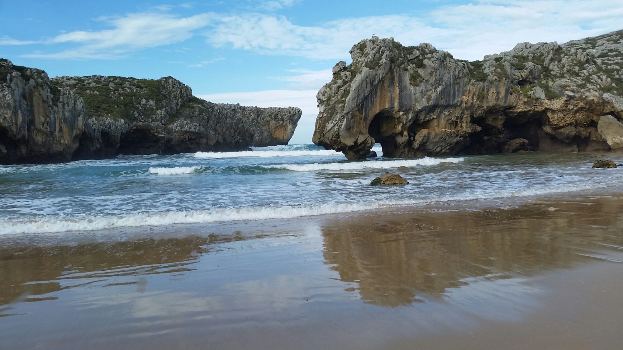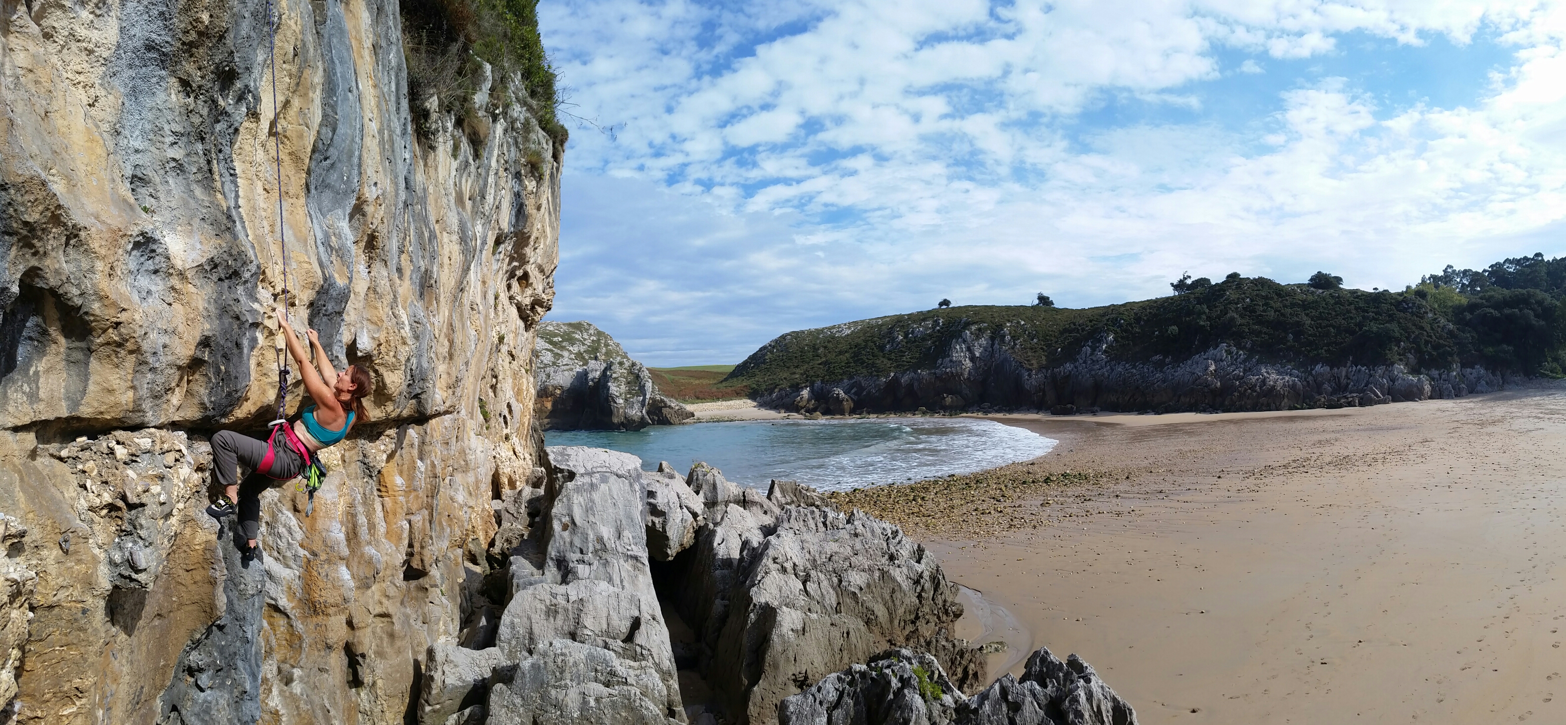 Having survived that excitement, and not been too inspired by the crags we recced along the way, we decided to head to the seaside, and Las Cuevas del Mar. Our sat nav decided to behave itself, and we were soon 500m from the crag, but separated from it by a very low, rough hewn tunnel through a wall of rock. No height sign, so we proceeded to udge with great caution. Gentle scraping from both top corners of the van suggested a height of a tiny bit less than our 3m, and I was pondering an intricate reversing manoeuvre, when it occurred to me to let down the air suspension.