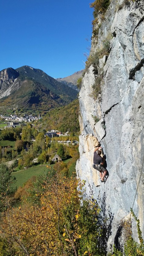 Having been toasted yesterday, we decided to head up the valley to gain altitude and a bit of coolth. The “sector camping” at Bielsa, about 15km south of the French border, looked ideal. A good range of grades and some long pitches.