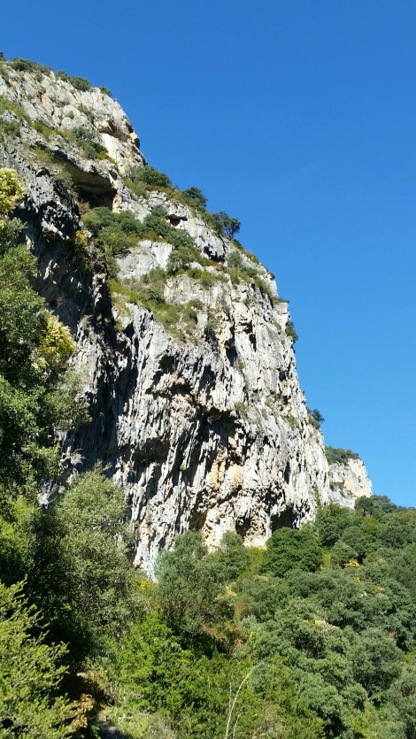 The forecast for the next day is heavy rain from 11am – the first crappie day since Galicia almost three weeks ago. We’re a bit frustrated, having had a rest day in the sunshine after Jim’s visit and the prospect of only one day climbing in four (I know – another very spoilt sulk). What we need is a great crag, near the road, and with an built-in 15m umbrella…. Luckily we knew just the place!