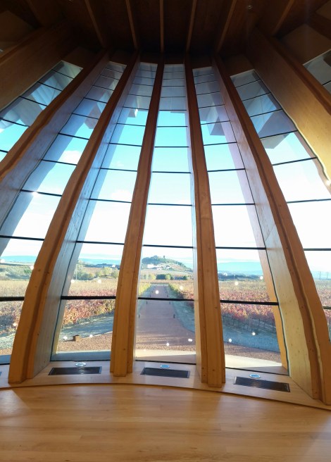 With a bit of help from the Internet, we settled on Ysios, a new, tiny winery that has been established with a huge investment from Pernod Ricard. This has set the place up in a fabulous, purpose built winery designed by architect Santiago Calatrava. It is pretty breathtaking – mimicking the foothills of the Sierra Cantabrica behind.