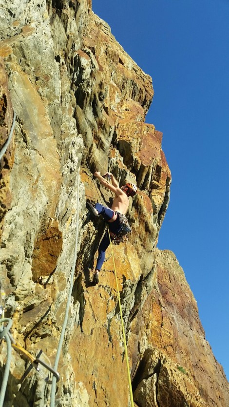 Then we moved onto Warpath, what a striking line! Quite a shock to the system for someone who’d been pulling (all be it pulling quite hard!) on plastic for 3 months. Jake cruised it, of course, with only the occasional squawk of anxiety (is there such a thing as a power squawk? )