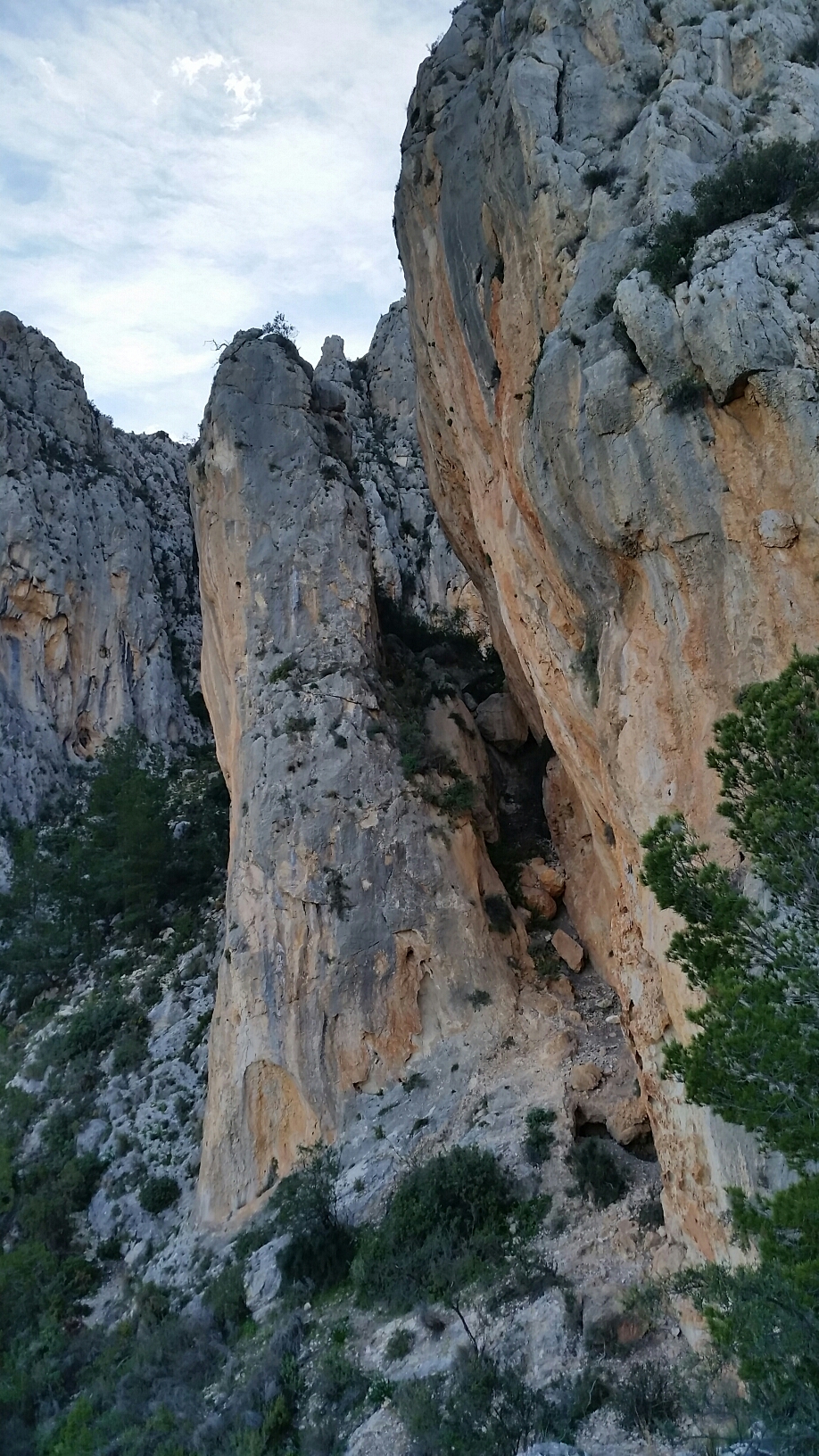Heading into the shade it was freezing! There were half a dozen small sectors in all. A sprinkling of low 6s and a bunch of steep pockety routes on compact rock in the 6c to 7b range, situated on two parallel fins. We found a good but very sharp 5+ and then I had a go at one of the trickier routes: Utero, 7a. This gets quite a write up on the Web and turned out to be a great route, taking the steep upper / right wall in the picture below