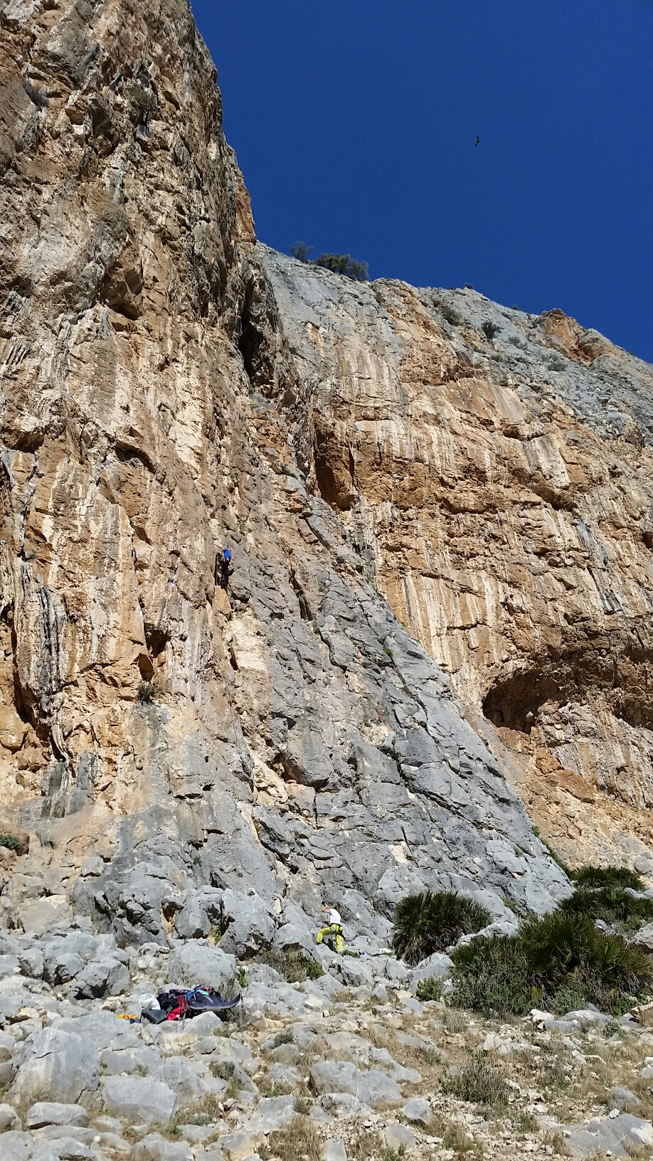 After a bit of a rest, the climb went surprisingly easily – a mammoth struggle, but I never really thought I was going to fall off. Nearing the top, I headed right and touched the chain to ‘tick’ the 7b version in Rockfax, then reversed a few metres and headed out left up a prickly undercut flake/groove. Just a couple more bolts lead to the original lower off of the route and my first 7b+ 🙂 * Happy Days!