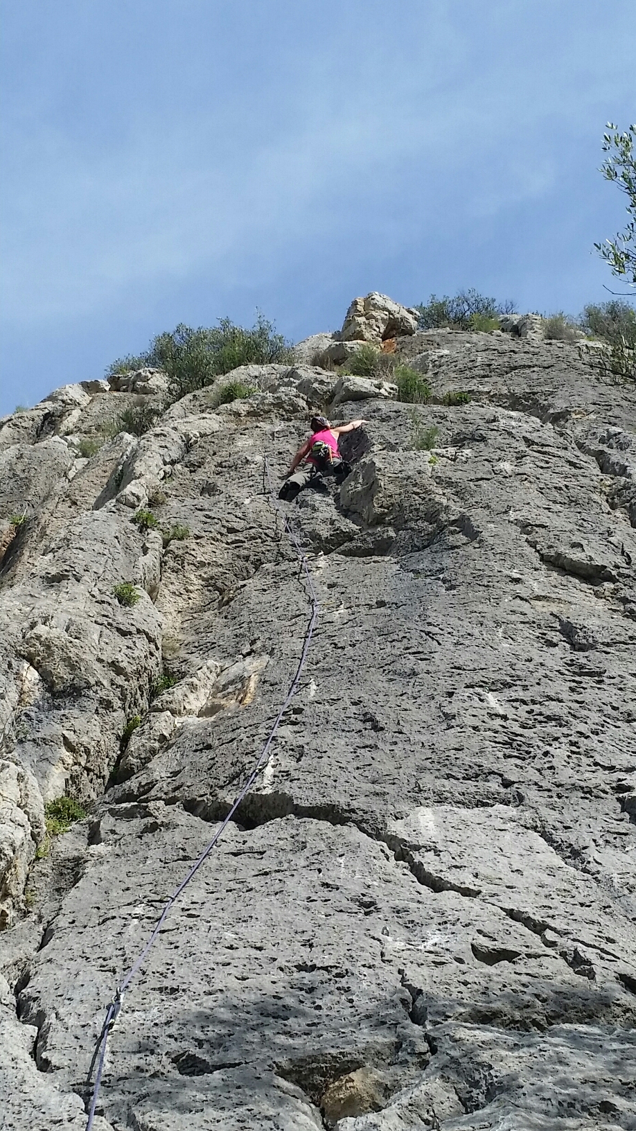 There’s an impressive mile-wide upper band of cliffs with a mix of long (sometimes trad) routes. Instead, for our first day, we explore the recent developments which have taken place on a lower tier, further along the hillside, giving another hundred or so single pitch routes.
