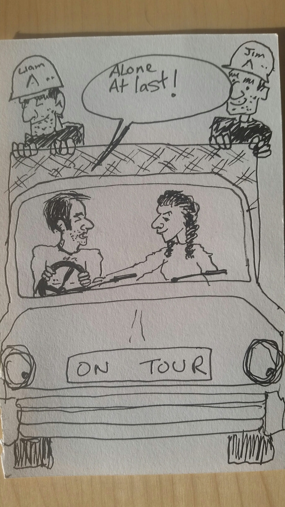 Jim’s final cartoon of the trip captured the mood in the van as we started our gentle trundle northwards….