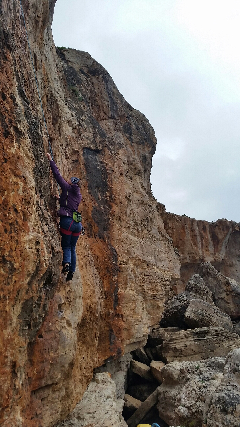 Against all probability it was dry when we arrived (though that didn’t last long) and we decided on a YECTOYD – the outstanding Germany 6a+, plastered in great crimpy flakes and crozzly footholds, it felt surprisingly secure despite the dampness and gale!