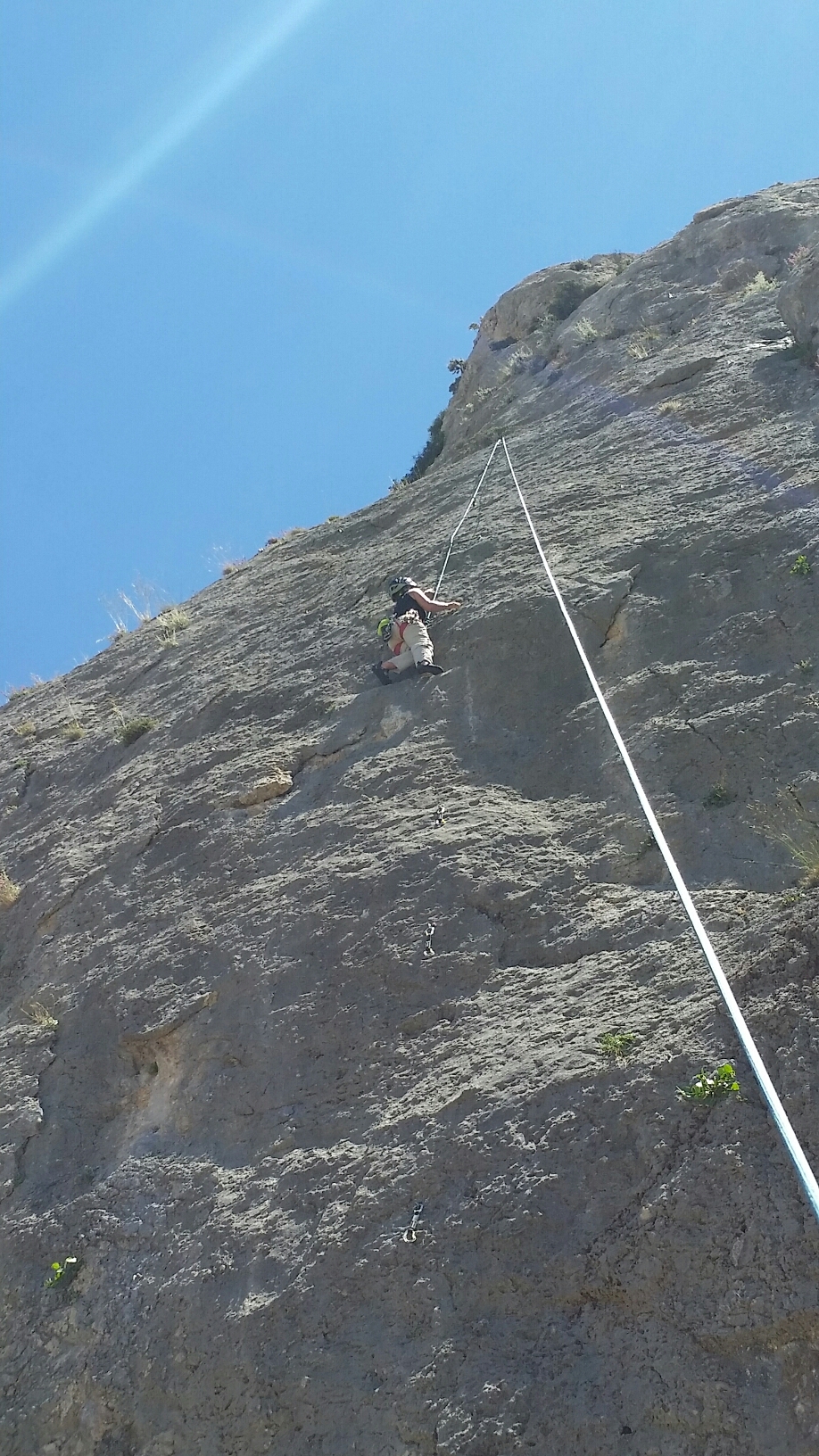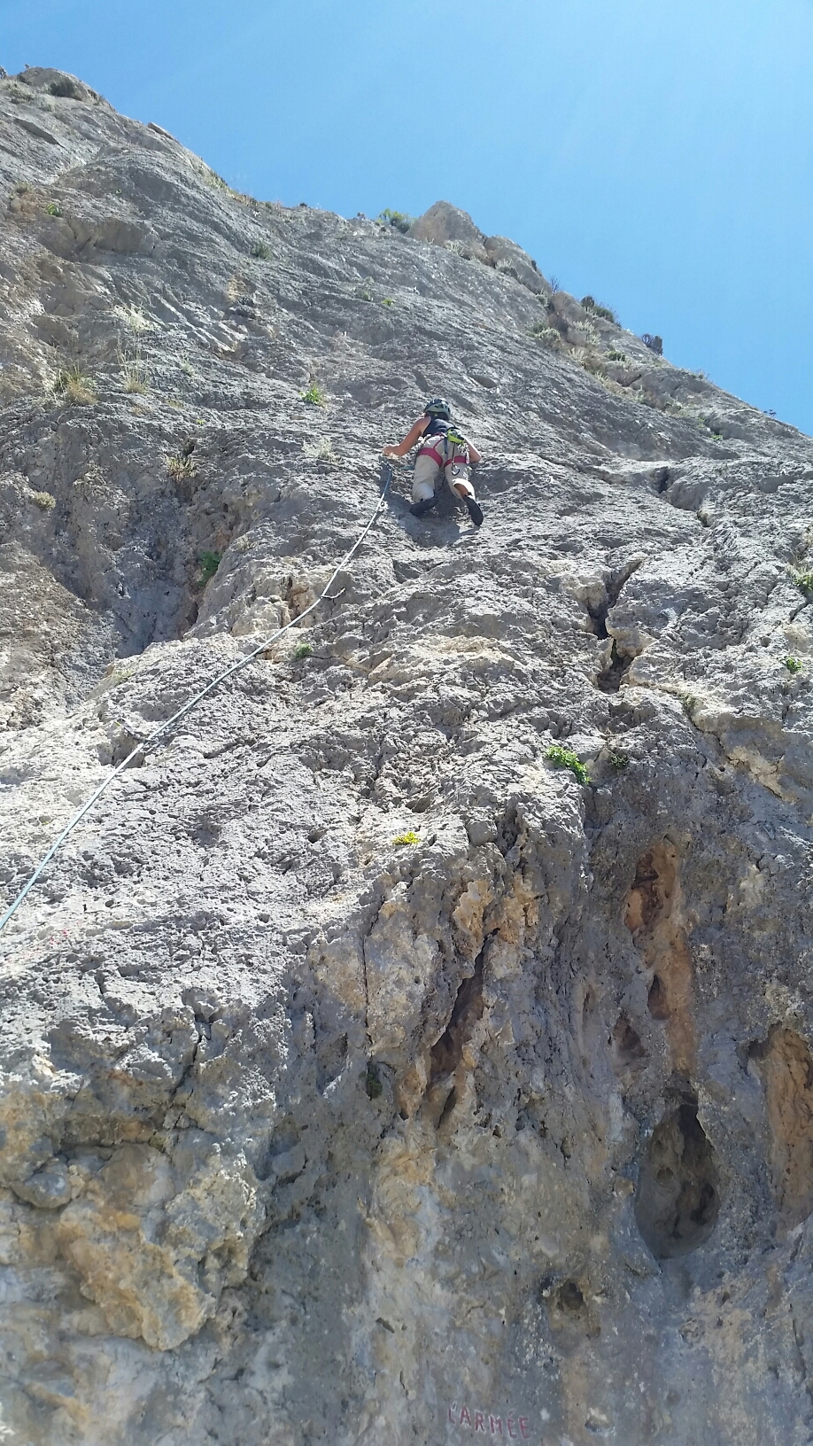 Having just snuck that one in with the sun dappling the wall (and getting annoyingly in the corner of the eye), Helen kindly put the clips in the adjacent route Helleni 7a+ which I managed in the full sun. Happy days!