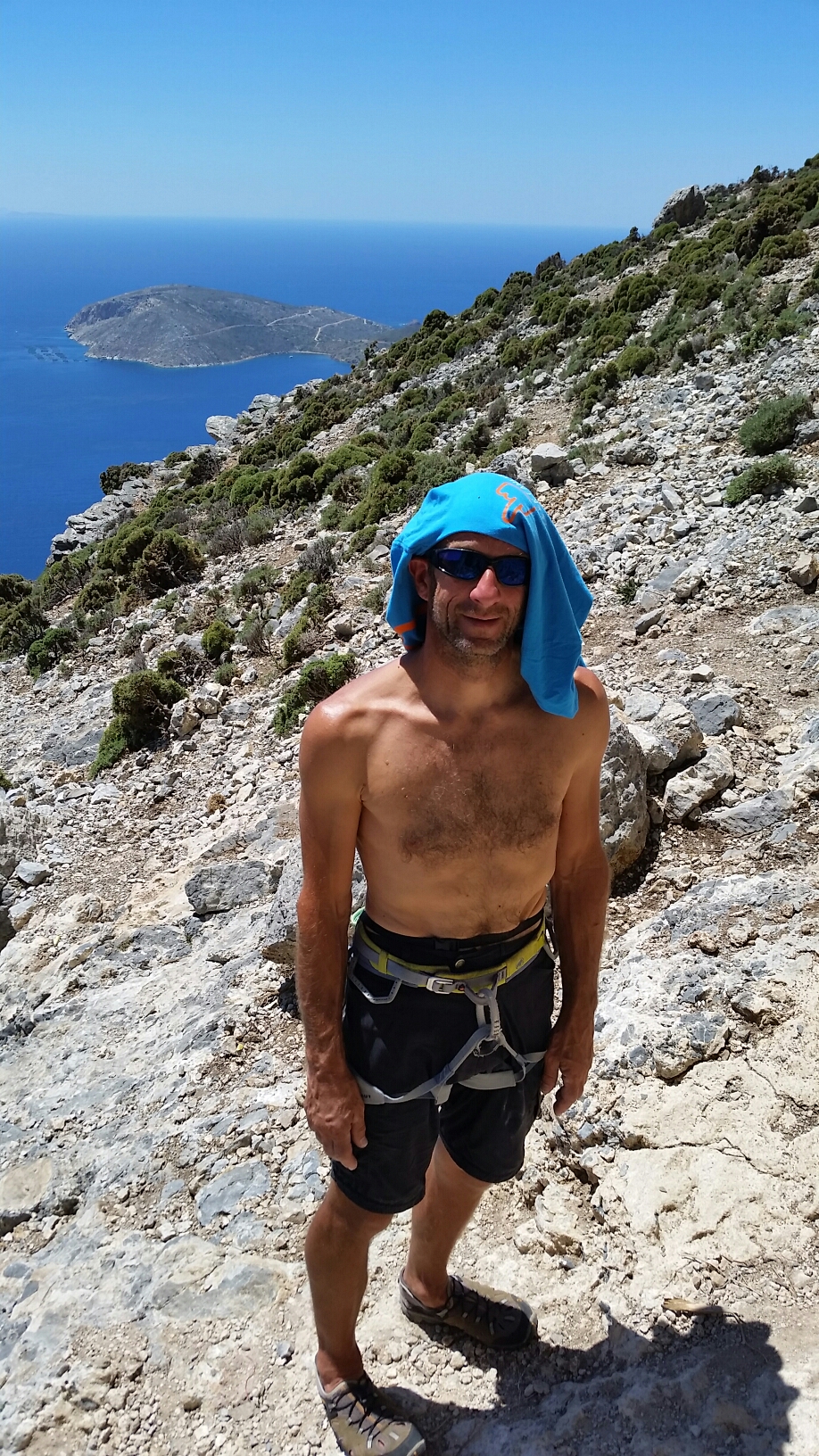 Meanwhile, back to “work”. With the forecast set fair for a few days, at 23C and unbroken blue skies, it’s time to either go high or go shady. Prophet Andreas offers altitude, set at about 450m above the sea and accessed from above via a winding road (strewn with rock debris caused by yesterday’s flash flooding in the thunderstorm). Forget the climbing, the views alone are worth the visit.