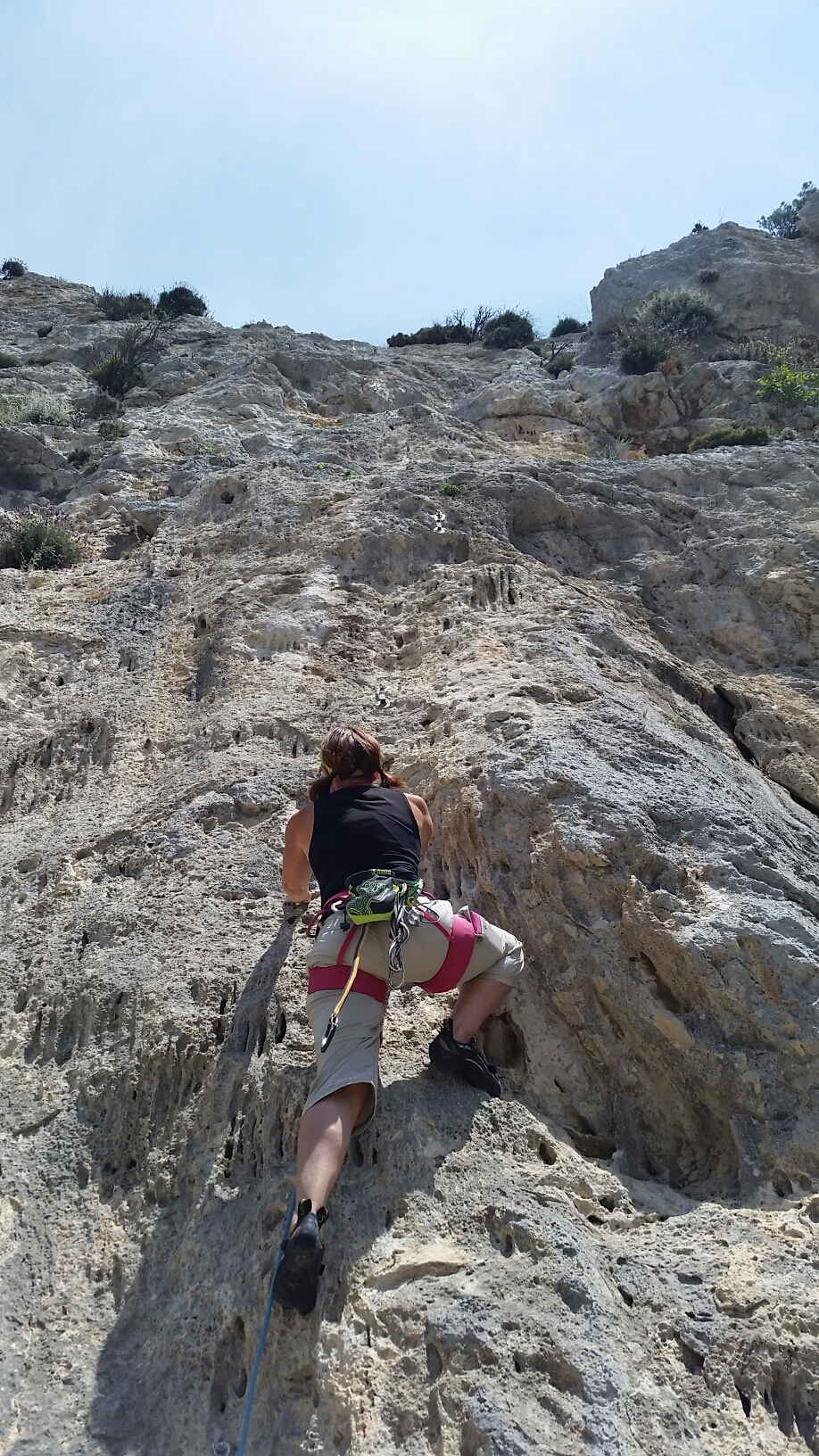 The route of the day for me was Climbers Nest a 3* 6a up some impressive cavey territory, with a 6c extension running to a full 40m. Here are some guys on the cave section.