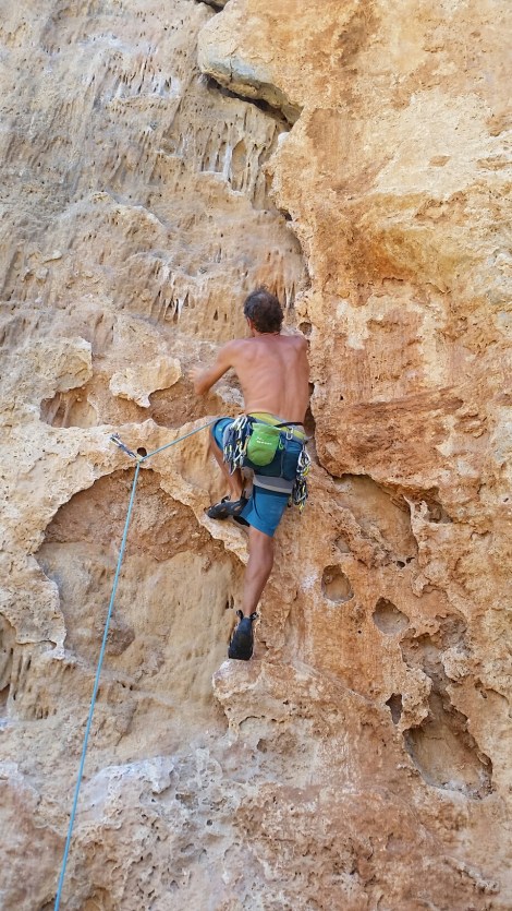 The next choice could have been to move right for the awesome looking Octopus up a massively overhanging crack and weighing in at 7b+, but common sense prevailed and instead we did the route to the left – TomBoy 6c on more (smaller) calcite pockets and flakes. Great!