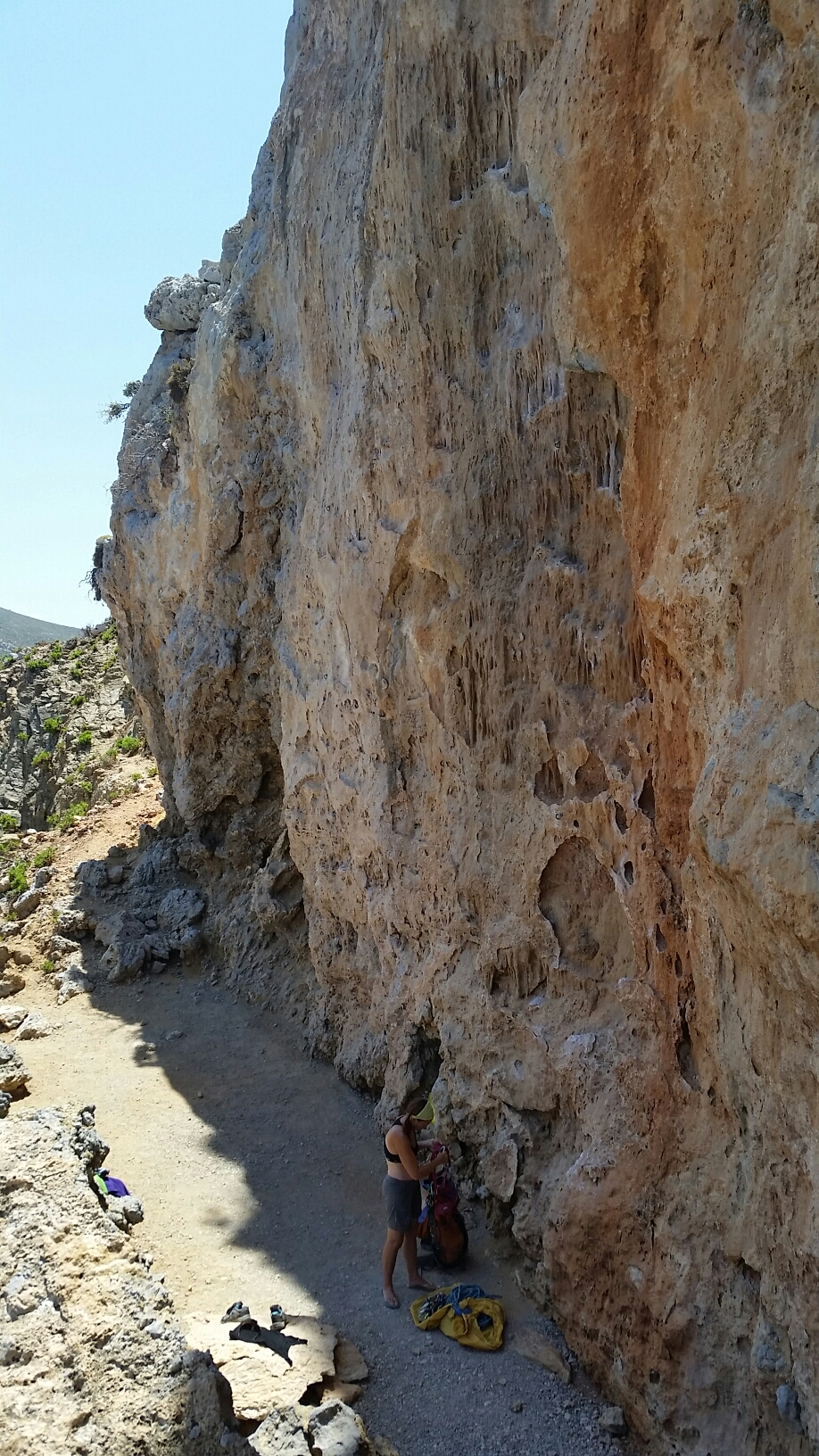 Over on the right side of the crag there’s a fantastic calcite wall with a striking 5c up it, Karpousi.