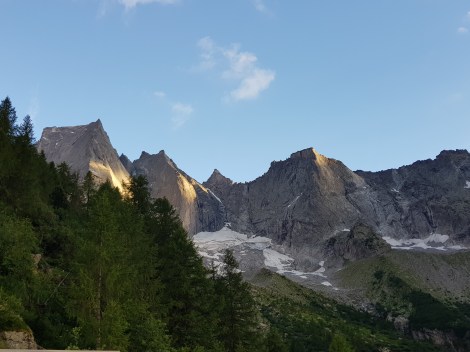 Piz Badile is less than 10km from the Mello Valley (as the crow flies), but it’s an hour and a half drive round and across the Swiss border to the village of Bondo followed by a 5km drive up the toll road (best CHF10 I ever spent!) to the start of the walk in to the Sasc Fura hut. The guidebook says 1hr45 up to the hut so we were surprised to find ourselves there in about 55 minutes, and I celebrated with an afternoon of sunbathing on the terrace whilst Jim went to recce the approach to the route.