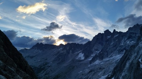 The NE face of Piz Badile was the main objective of the trip, and we were in two minds whether to do the classic Cassin route or the more modern Another Day In Paradise (harder, more sustained, a bit shorter and importantly much less popular!) The hut full of 43 climbers, the majority of whom were after the Cassin, helped make our minds up, together with the fact that we could rap the route to get down ADIP whereas everyone I know who’s done the Cassin and descended the N ridge has had an epic and / or a benightment.