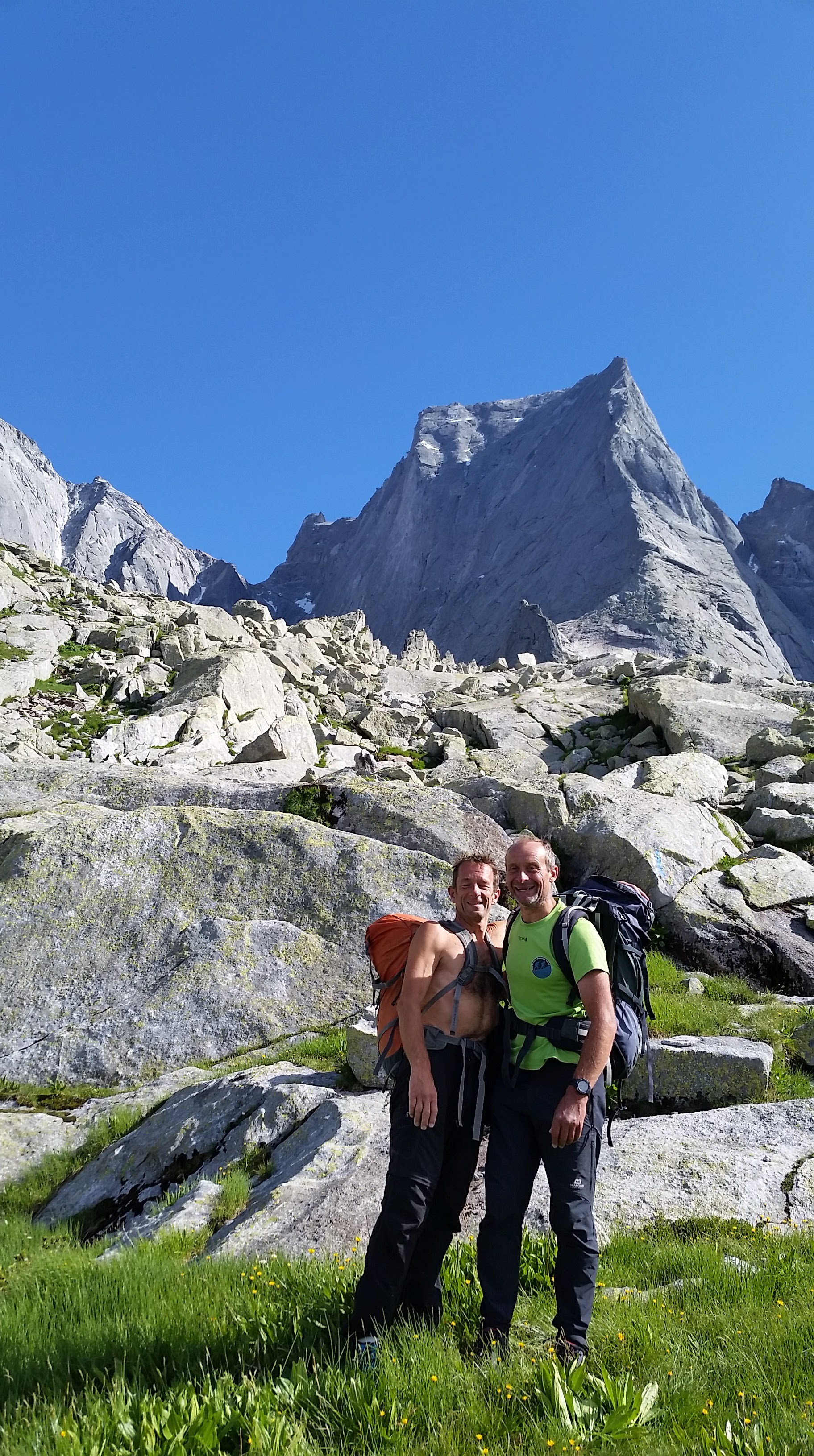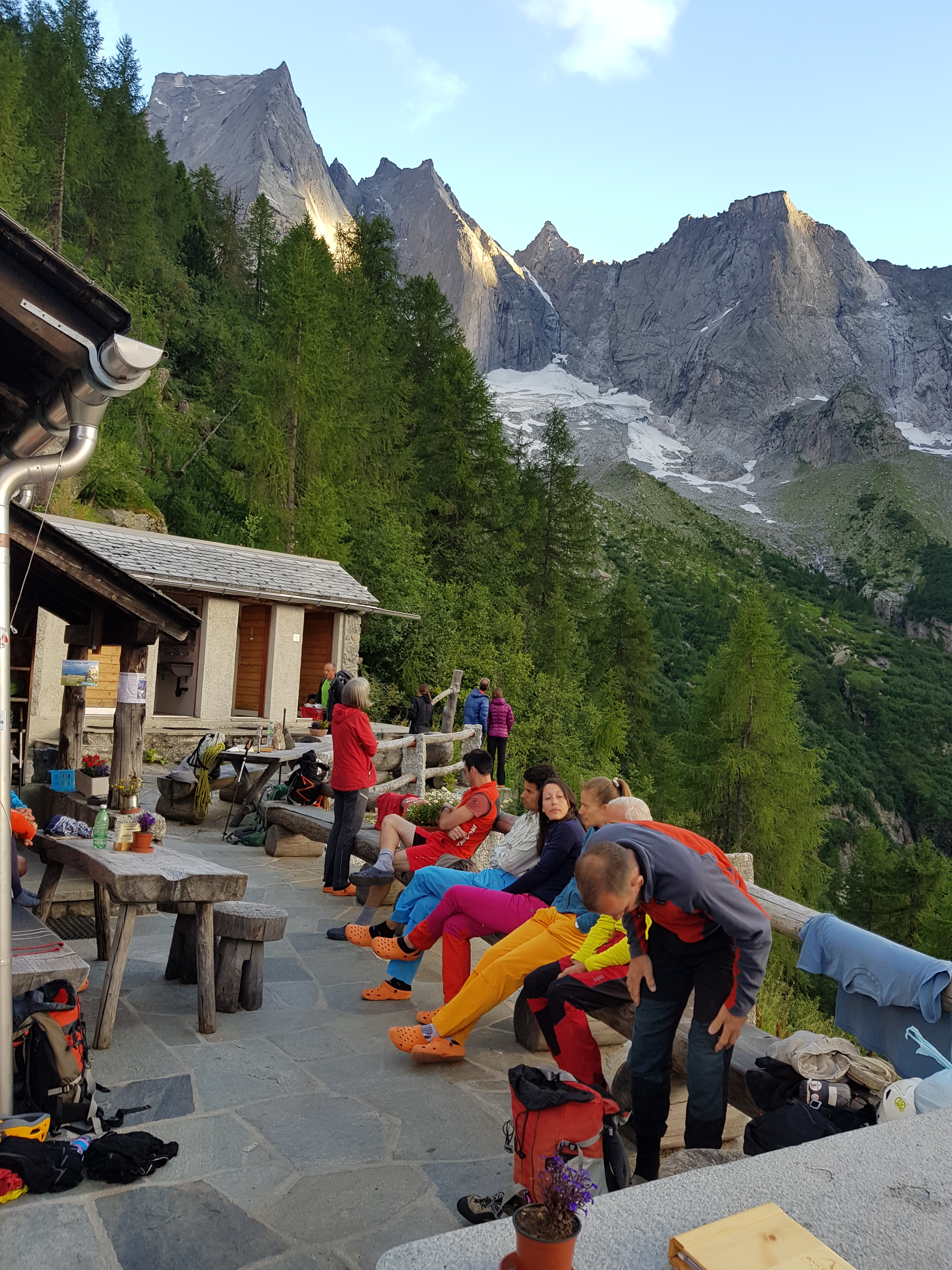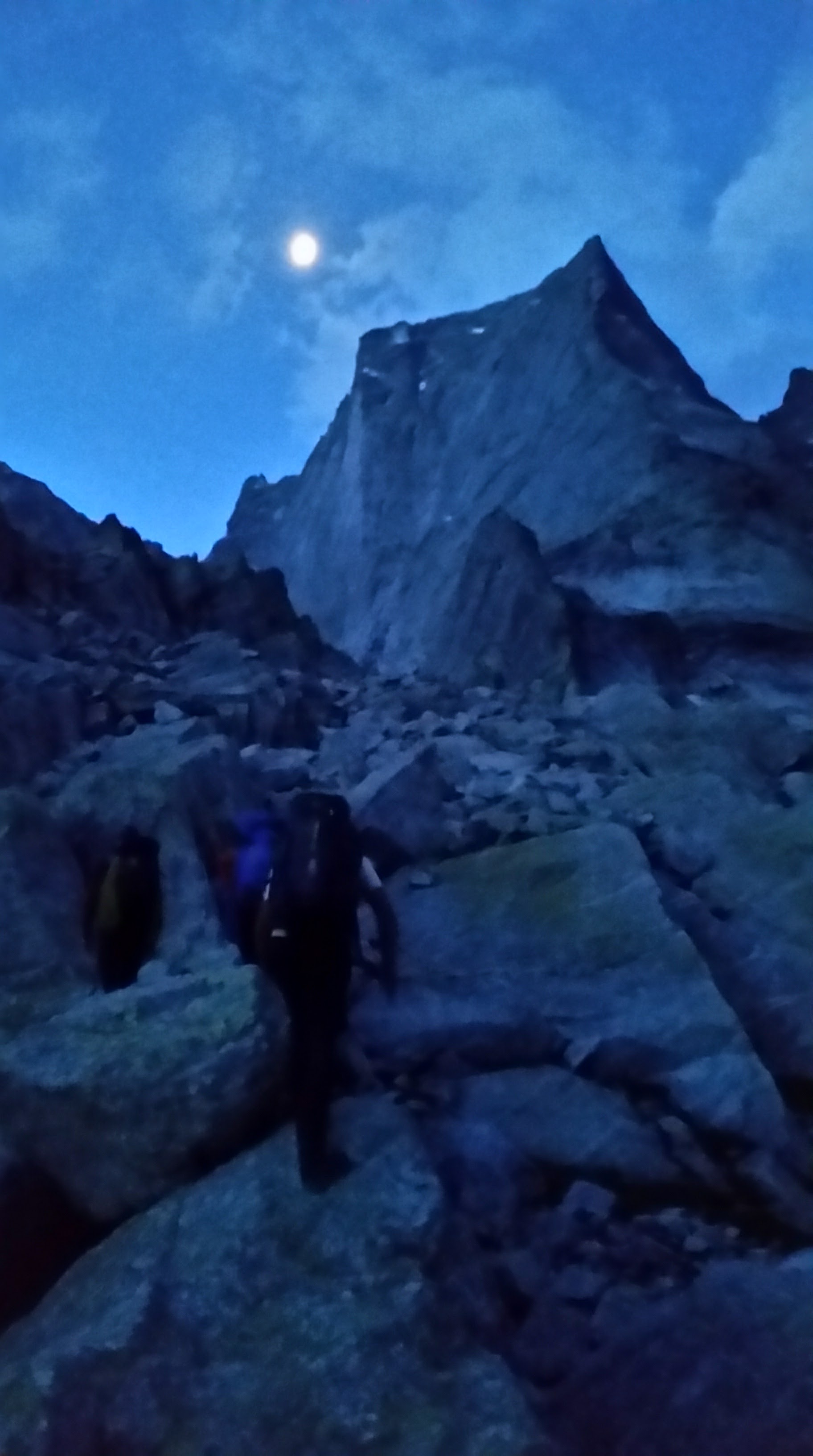 The NE face of Piz Badile was the main objective of the trip, and we were in two minds whether to do the classic Cassin route or the more modern Another Day In Paradise (harder, more sustained, a bit shorter and importantly much less popular!) The hut full of 43 climbers, the majority of whom were after the Cassin, helped make our minds up, together with the fact that we could rap the route to get down ADIP whereas everyone I know who’s done the Cassin and descended the N ridge has had an epic and / or a benightment.