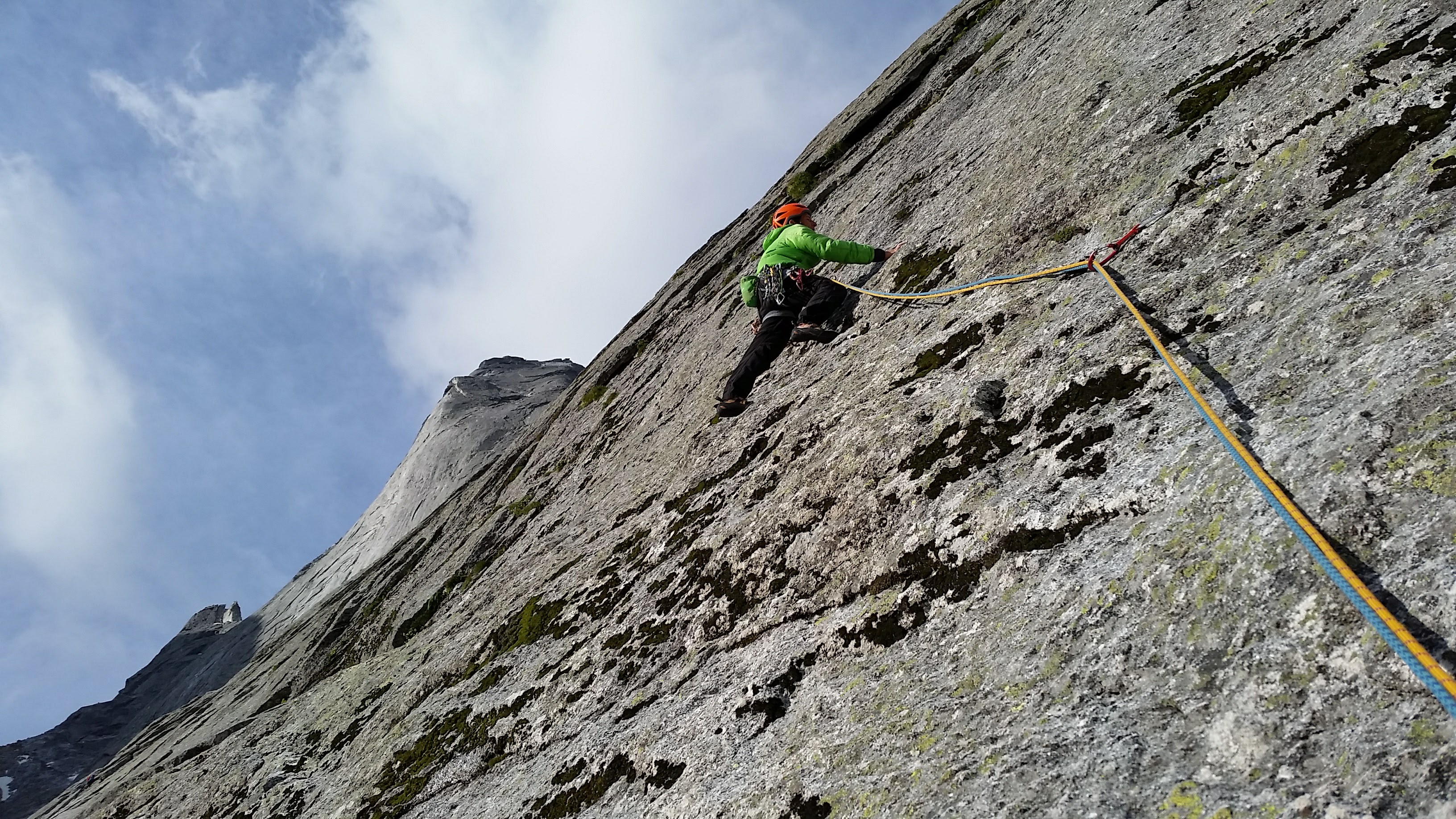 The route starts with a bang – pitch 1 off the terrace is the crux and given 6b/c depending which guide you use. Not the ideal warmup before 7am when it’s close to freezing and you can barely feel your fingers. Happily it’s my kind of crimpy climbing and the pitch is fairly well bolted (comparatively… half a dozen in 30m!) The rock is outstanding, very compact knobbly granite, with little scope for natural protection.