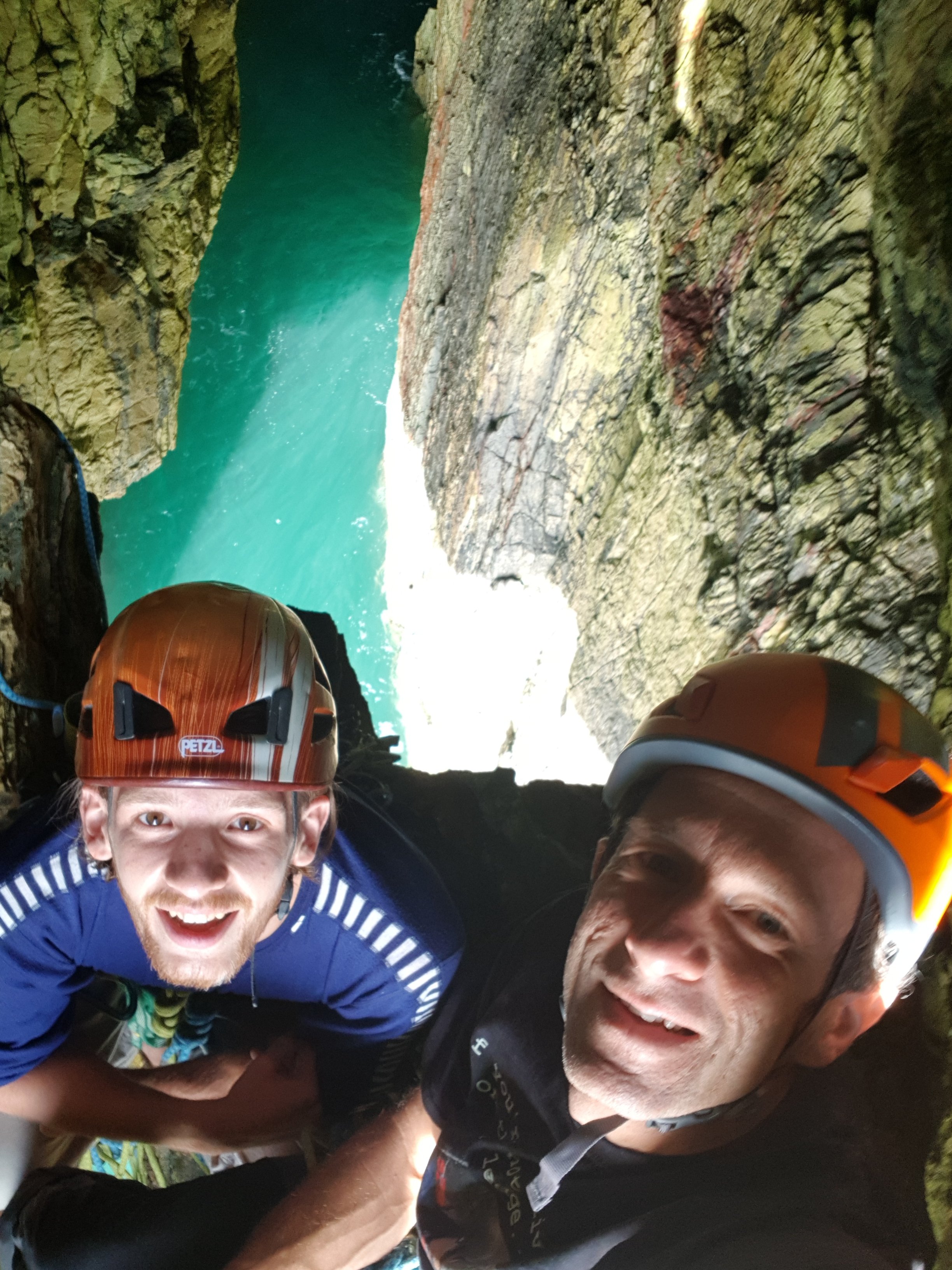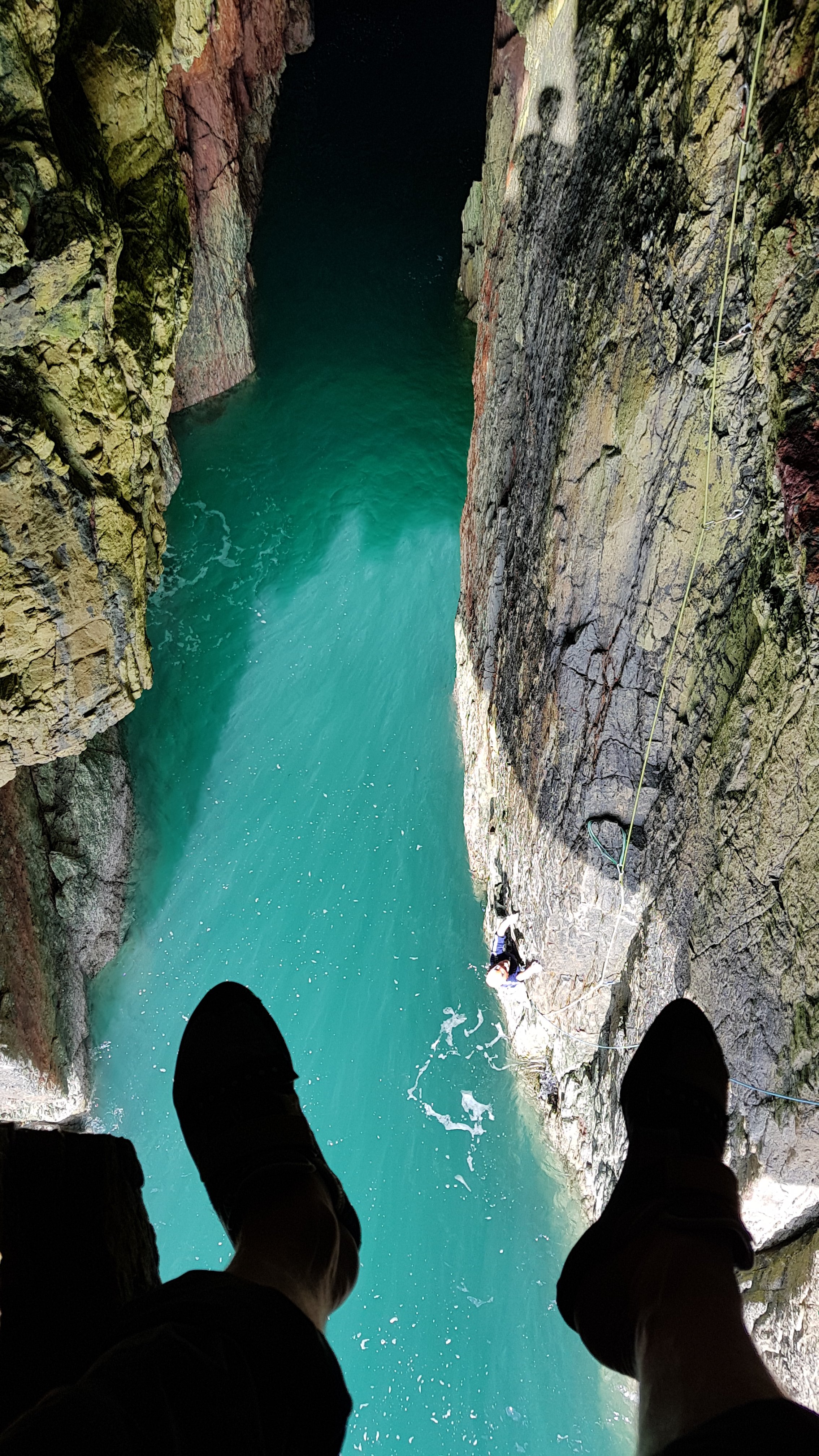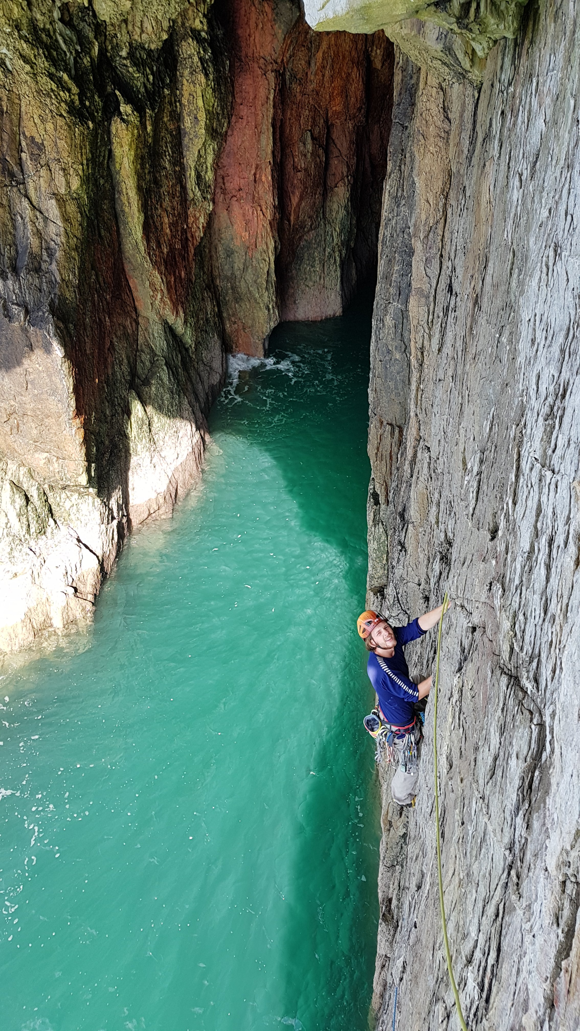 Next to decide on a route… Something adventurous but not too desperate, haven’t done it before and ideally on some rock that is banned for the rest of the year… Flytrap fitted the bill. A 4-pitch E2 adventure into a huge sea cave and out again through a “skylight” in the roof.