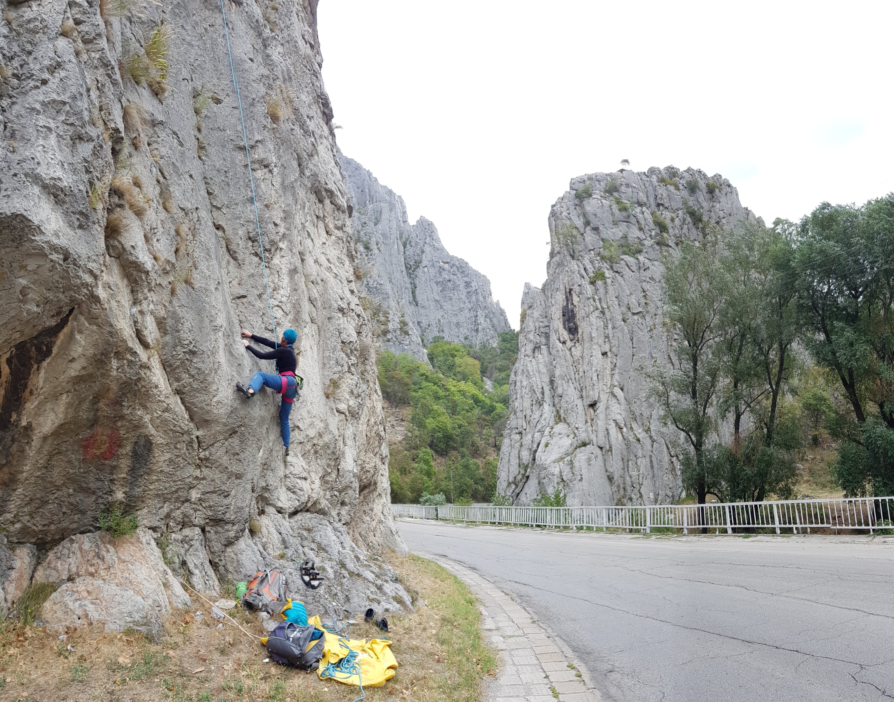 Probably the most famous and extensive climbing area in Bulgaria. Our well researched plans came somewhat unstuck as the campsite we’d been hoping to use as a base turned out to have closed for the year at the end of August. We couldn’t drive past without a visit, so arriving late we managed to find a fabulous overnight parking spot high above the main gorge with great views down to the crags.