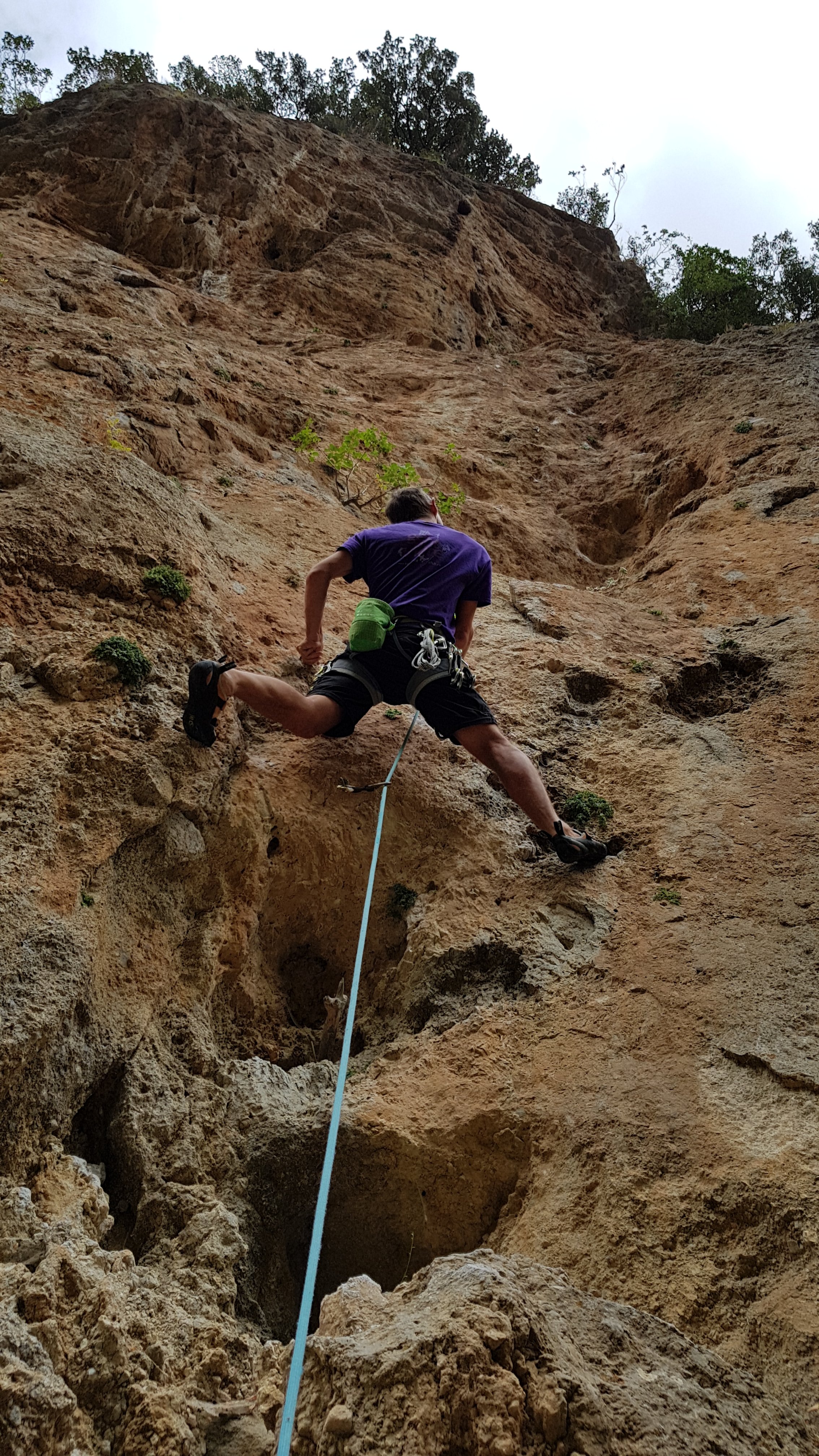 I was suitably encouraged to try Niskitos Deipnos, a really impressive overhanging line of tufas. Another heartbreak as I ran out of gas just beneath the chain, trying to work out a sequence (spoiler alert – pull out left then back right to clip). I couldn’t decide whether to be chuffed or gutted when I realised I’d inadvertently strayed onto the adjacent 7b+ in the tufa maze around half height 😦 / :-)? I decided to award myself a half tick for trying hard!