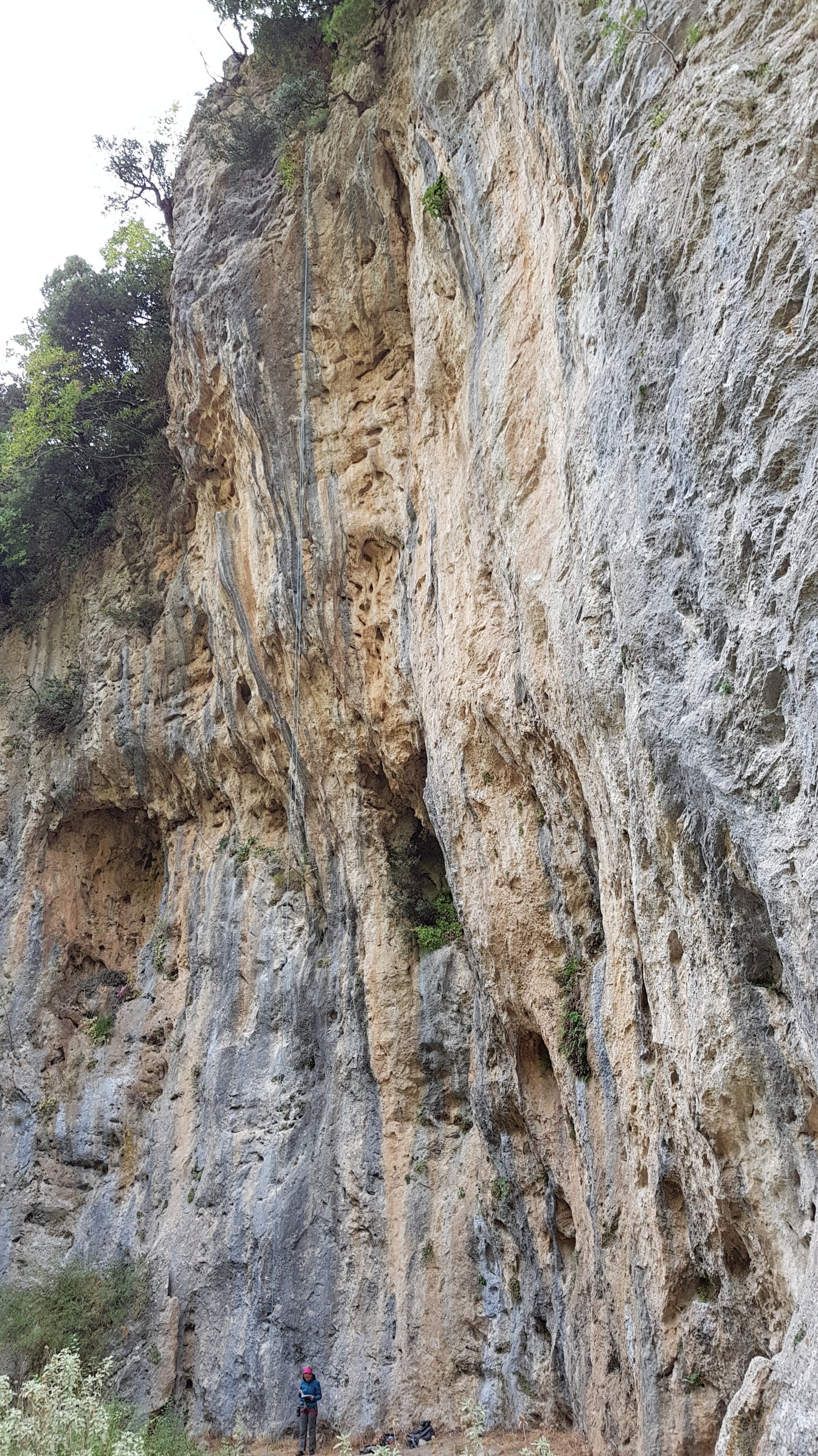 And a shady (not that we needed to worry, with leaden skies and a bit of drizzle) tufa and pocket strewn wall below road level next to a dry stream-bed. We climbed on the latter and were pretty impressed. Prigipesia 6a+ gets the musical note symbol, but is spoiled by having one trickier sharp move,