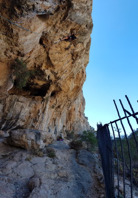 The shot below gives a better idea of the length and sideways nature of the route, and the upside-down land it covers (plus the fence spikes encouraging an attentive belay!)