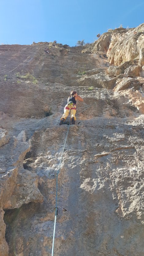 Moving on to the cave we did both the “musical note” 6b+s Boubouki and Pontiki sto Syri. Both outstanding in their own rights and both with extensions which up the ante considerably. The latter (7b) has a pockety roof after about 30m which saw me off. I made better progress on the Boubouki extension (7a+) which takes an overhanging tufa thread and then pockets up an immaculate leaning wall before a hard-to-read crux near the top. Faced with chalk out to the left and the right, and fading strength, I guessed left and ran out of steam and out of ideas with the (now obvious) jug just a tantalising couple of feet to my right. My shout of “take” got lost in the hubbub below and I plummeted about 20ft as fingers finally gave way. A shame as it’s one of the best routes I’ve been on this trip. Photo below shows a strong Spanish girl top roping it – red hat about 2/3 of the way up the crag above the biggest tufa forest.