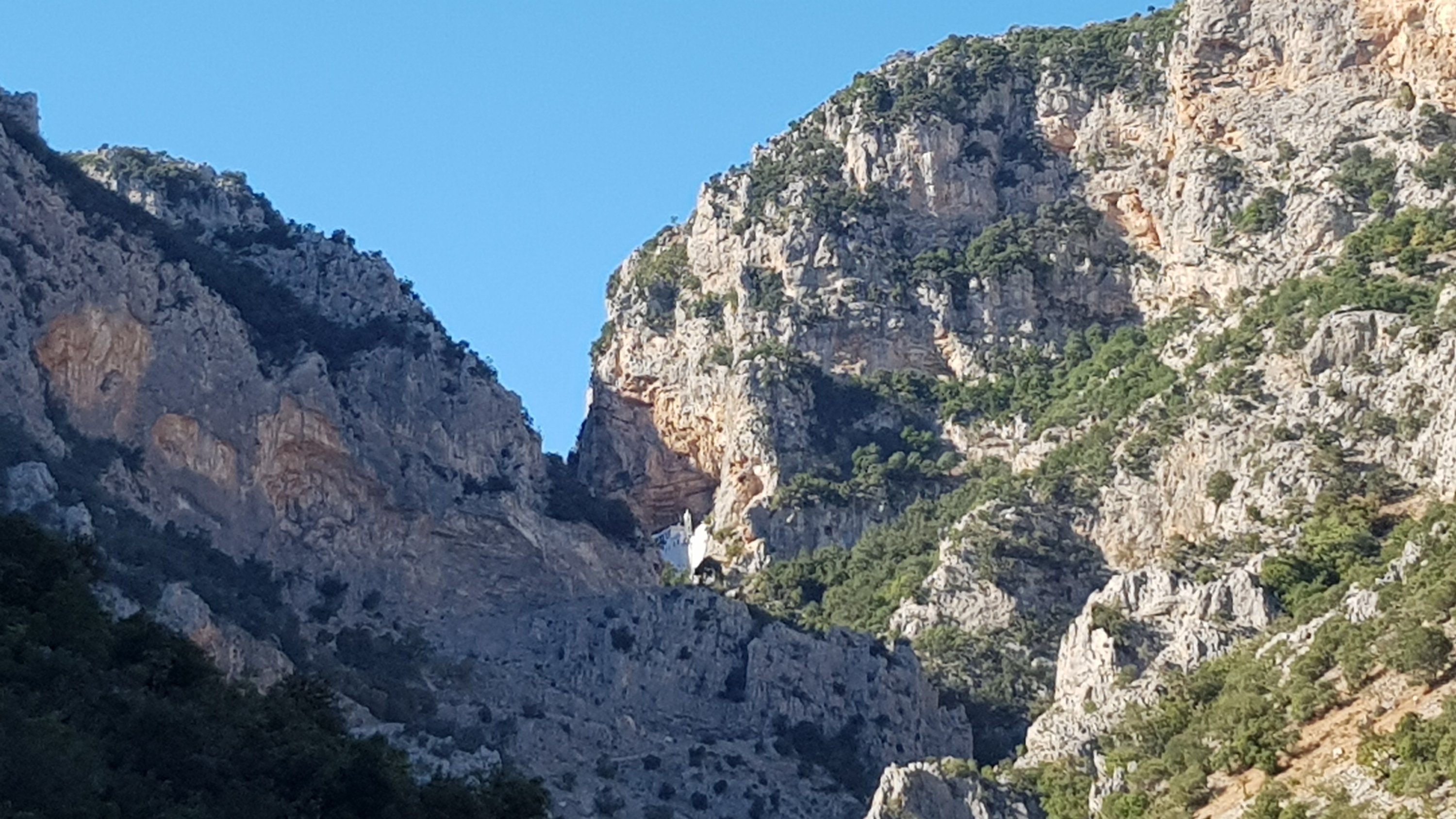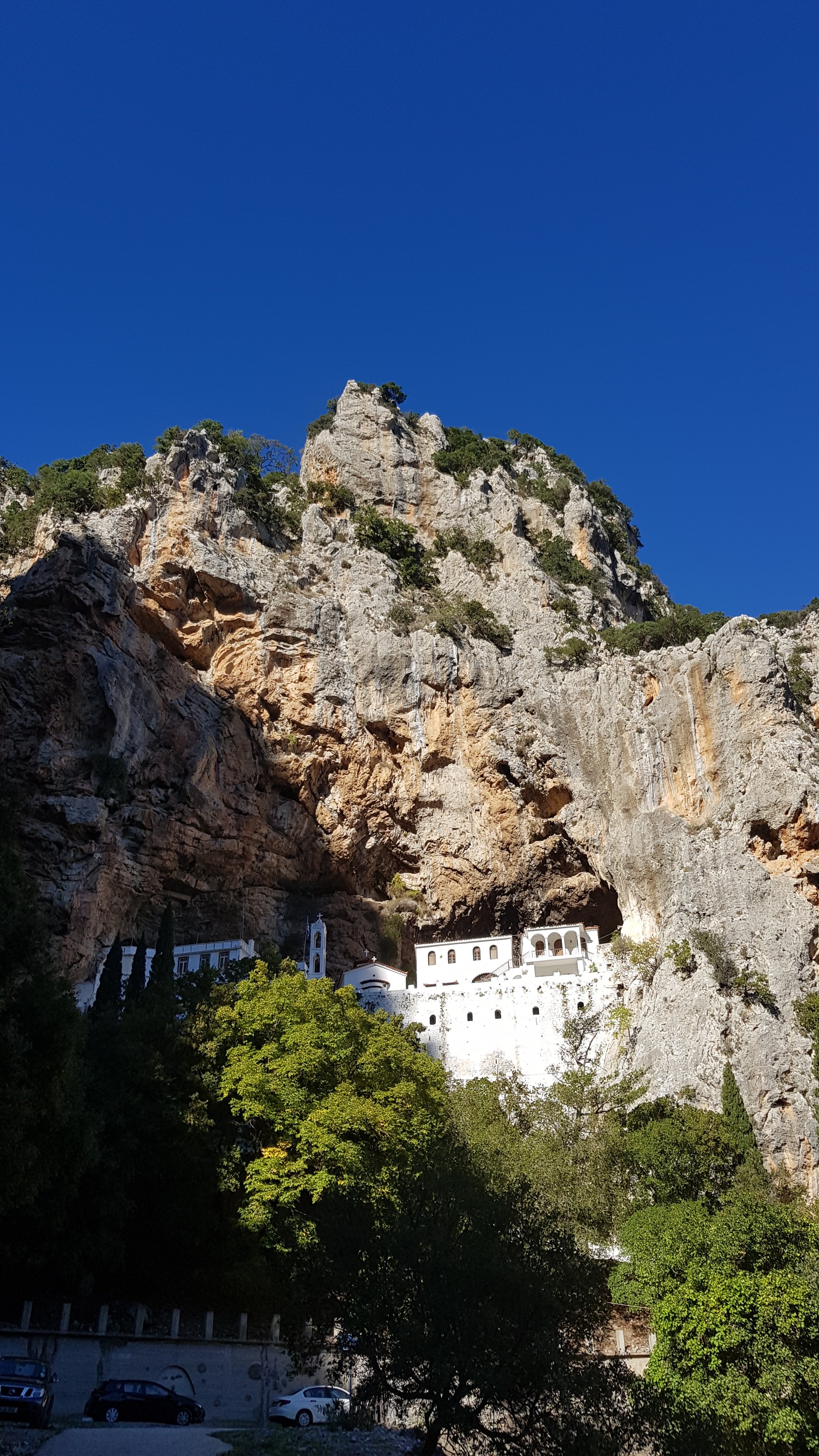 St Nicholas is duly selected for today’s fun. Another zigzagging road (this one insanely so), another gleaming white Monastery perched improbably amidst red rock walls, and another shady crag.