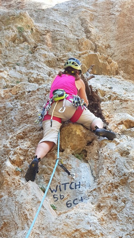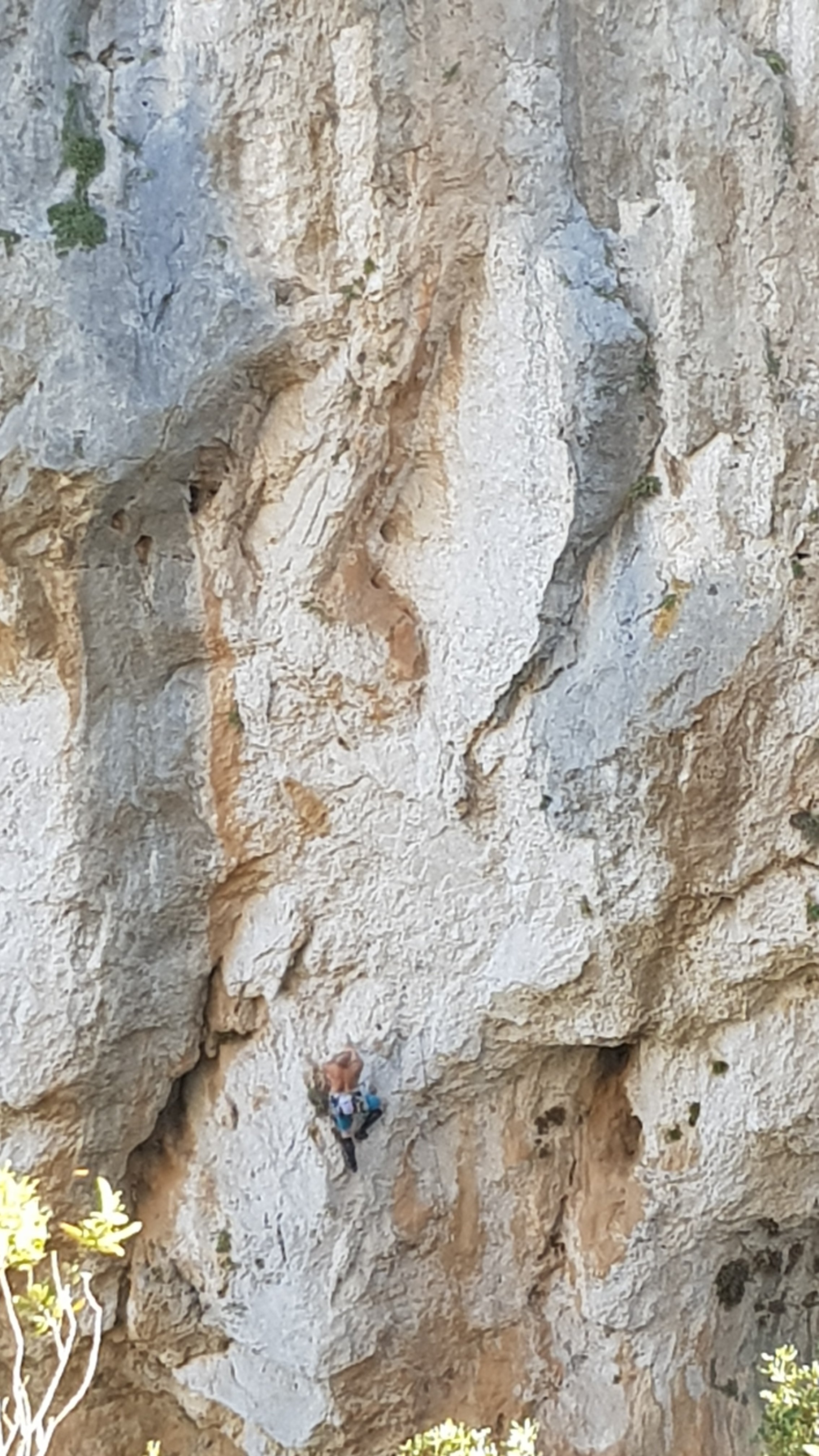 Our first route, Kilfinan, gets marked down as the worst of the trip – grungy struggle on poor, dirty rock ending in a tree filled gully. Avoid it! The neighbouring “Monks in the Gym” didn’t look a whole lot better, but was almost worth doing just for the brilliant name! Instead we did Apo Michanis Theos, a 35m 7a up mostly vertical, quite “traddy” white rock with a hard (too hard for me) crux crossing a blank undercut wall on crozzly pebble holds, and another tricky sting in the tail. Here’s a fellow Brit making a better job of it.