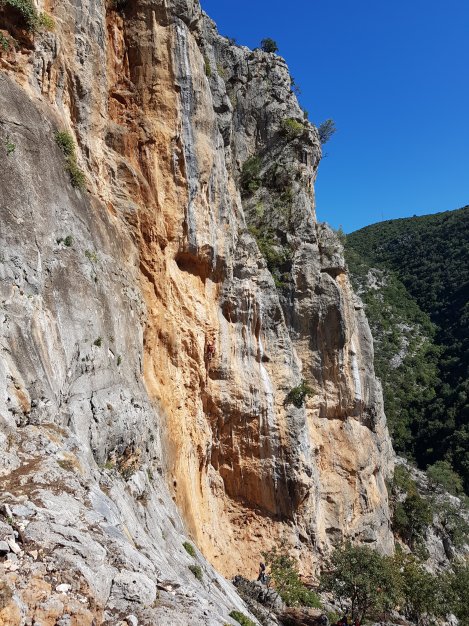 We warmed up on Porto Lenidi, 6a, which was worth its 3*s. I was keen to get on Ramasca, a 20m “musical note” 6c+ with an extension to rack up Super Ramasca, a 40m 7a+. The start takes an overhanging, tufa filled corner with a a tricky move to pull onto a wall and then up to a little roof. A vestige of shade made the lower section just bearable, and I got to the midpoint lower-off with enough juice in the tank to press on for the “super” tick. This overcomes the roof to pull onto another single tufa system which then runs into pockets and a final crimpy pull before the chains. Really pleased to get that one in the bag! Here are a couple of pics of an Austrian guy making a smooth ascent just afterwards…