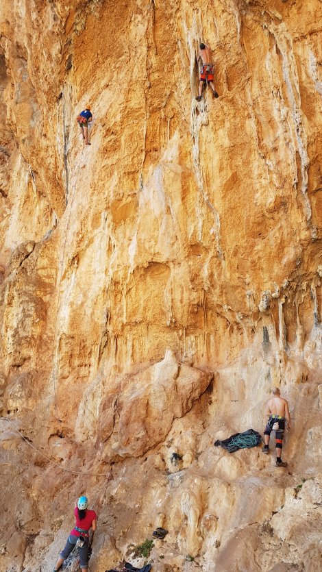 The access is via a very well graded ancient path and lives up to the guidebook promise to deliver you to the crag in about 20 minutes. However, it was already pretty toasty when we arrived. It’s an interesting crag that alternates orange tufa sections with grey slabs, making for a good variety of styles and grades.