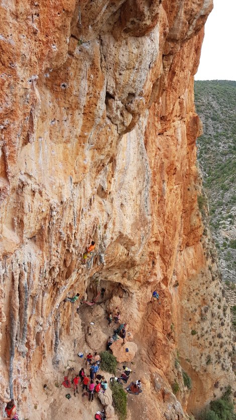 I should probably have headed to the beach at that point, but instead had an ultimately unsuccessful attempt on Yoko Mono (excellent wall with a bouldery tufa start and sustained pocket pulling) and similar result on NASA (both 7a) which I wouldn’t recommend as being worth the effort. Here’s an Italian lad on Yoko (RHS in blue) with Andy on an unknown route to the left.