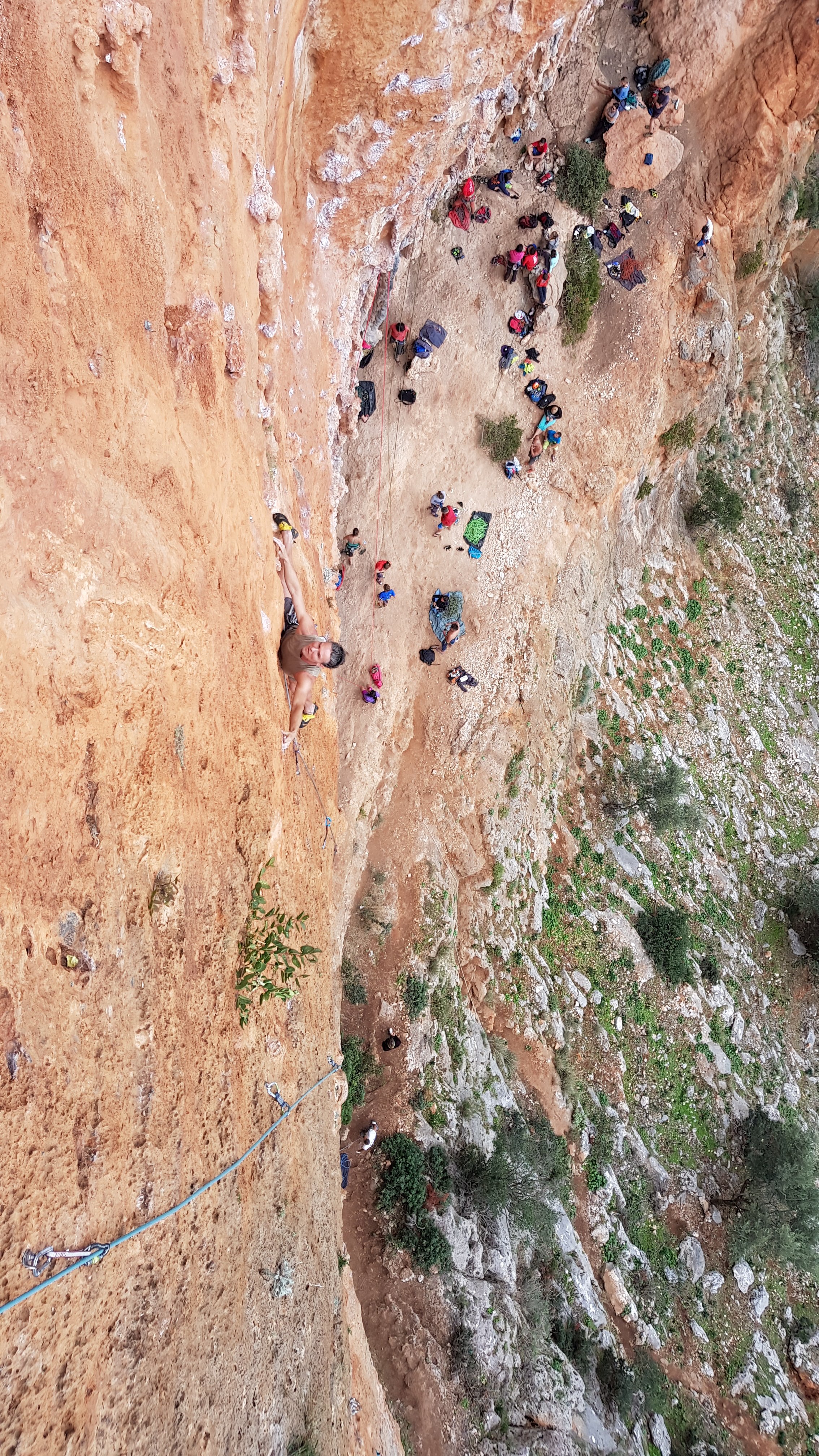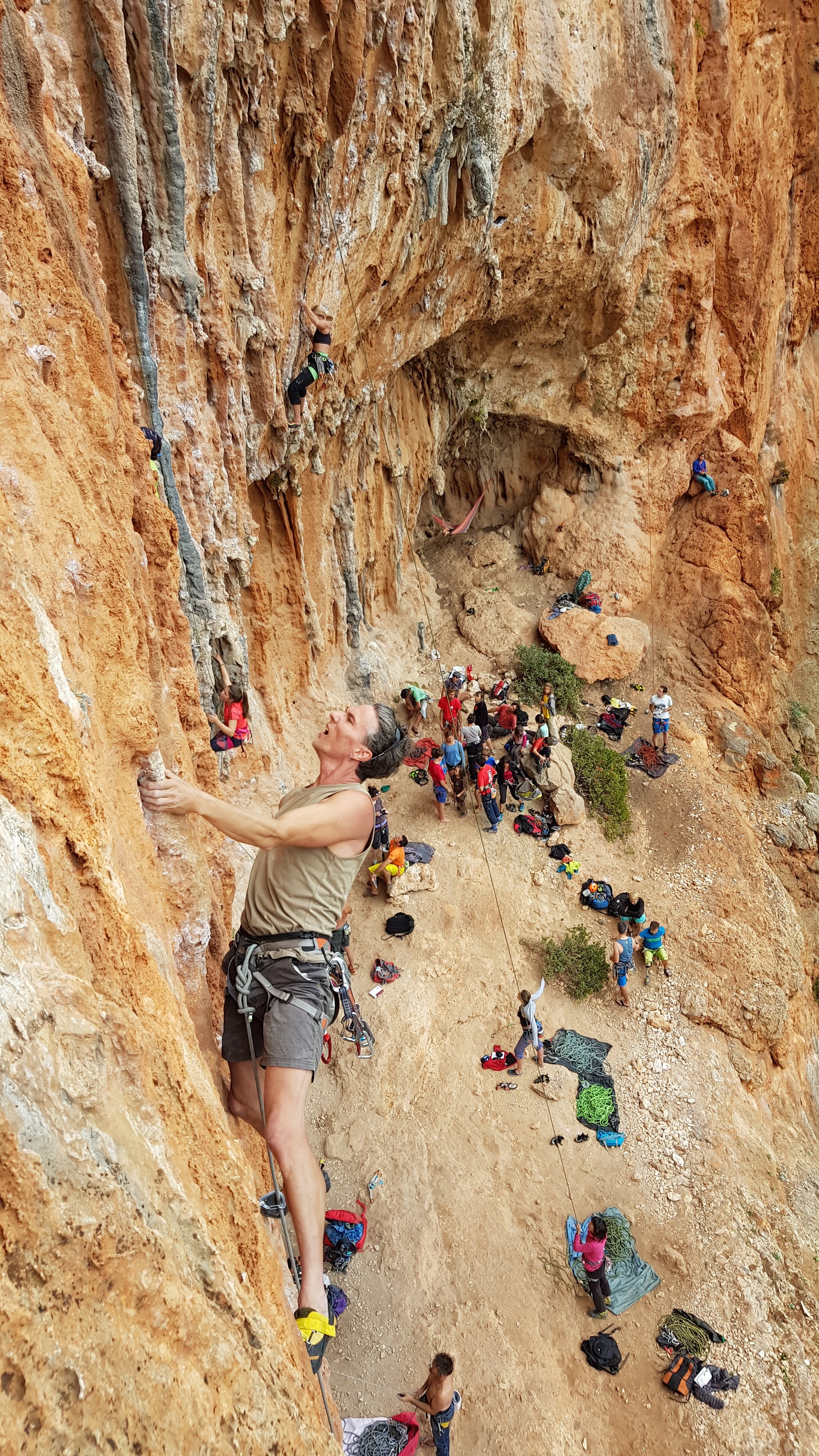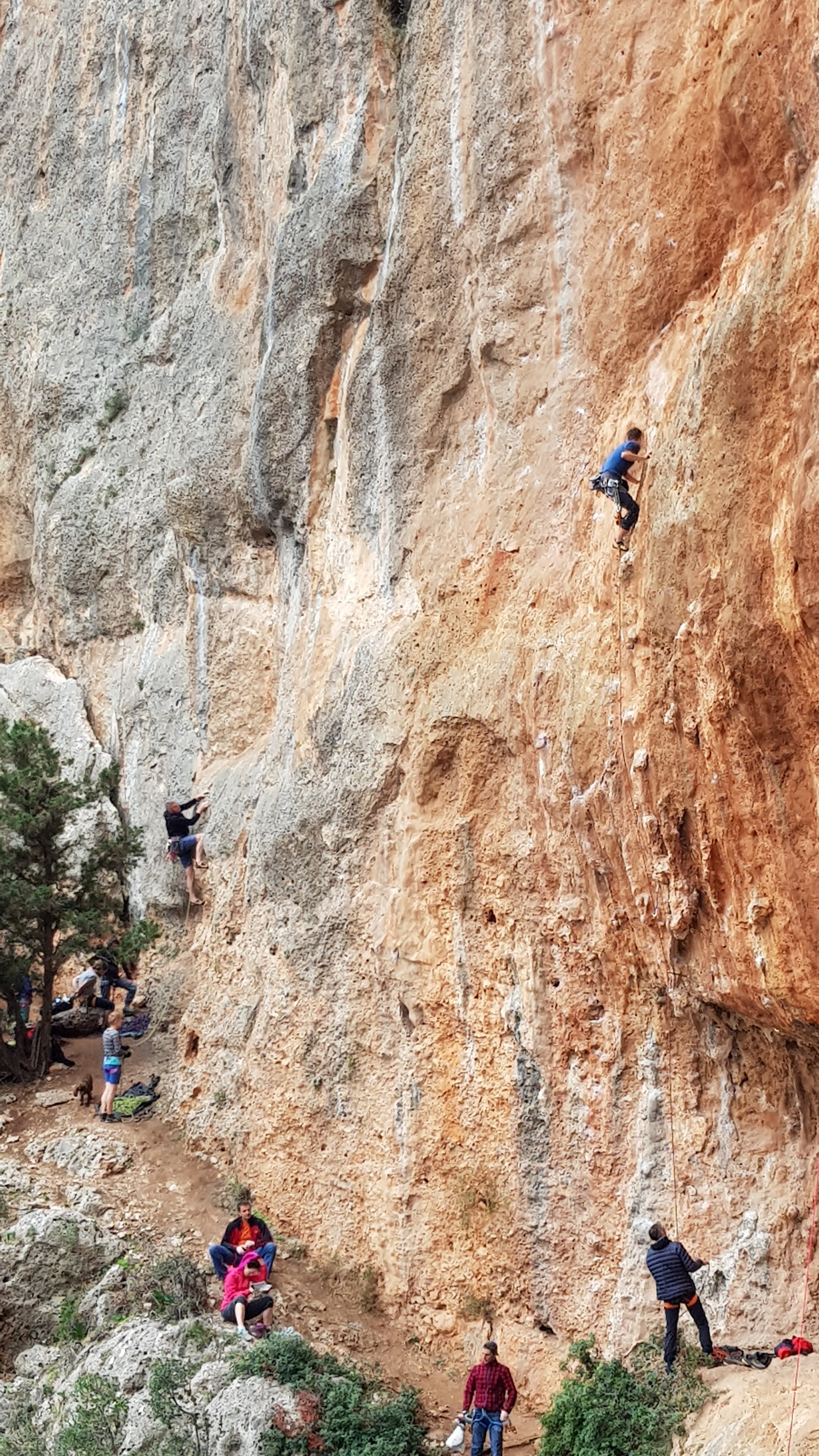 I should probably have headed to the beach at that point, but instead had an ultimately unsuccessful attempt on Yoko Mono (excellent wall with a bouldery tufa start and sustained pocket pulling) and similar result on NASA (both 7a) which I wouldn’t recommend as being worth the effort. Here’s an Italian lad on Yoko (RHS in blue) with Andy on an unknown route to the left.