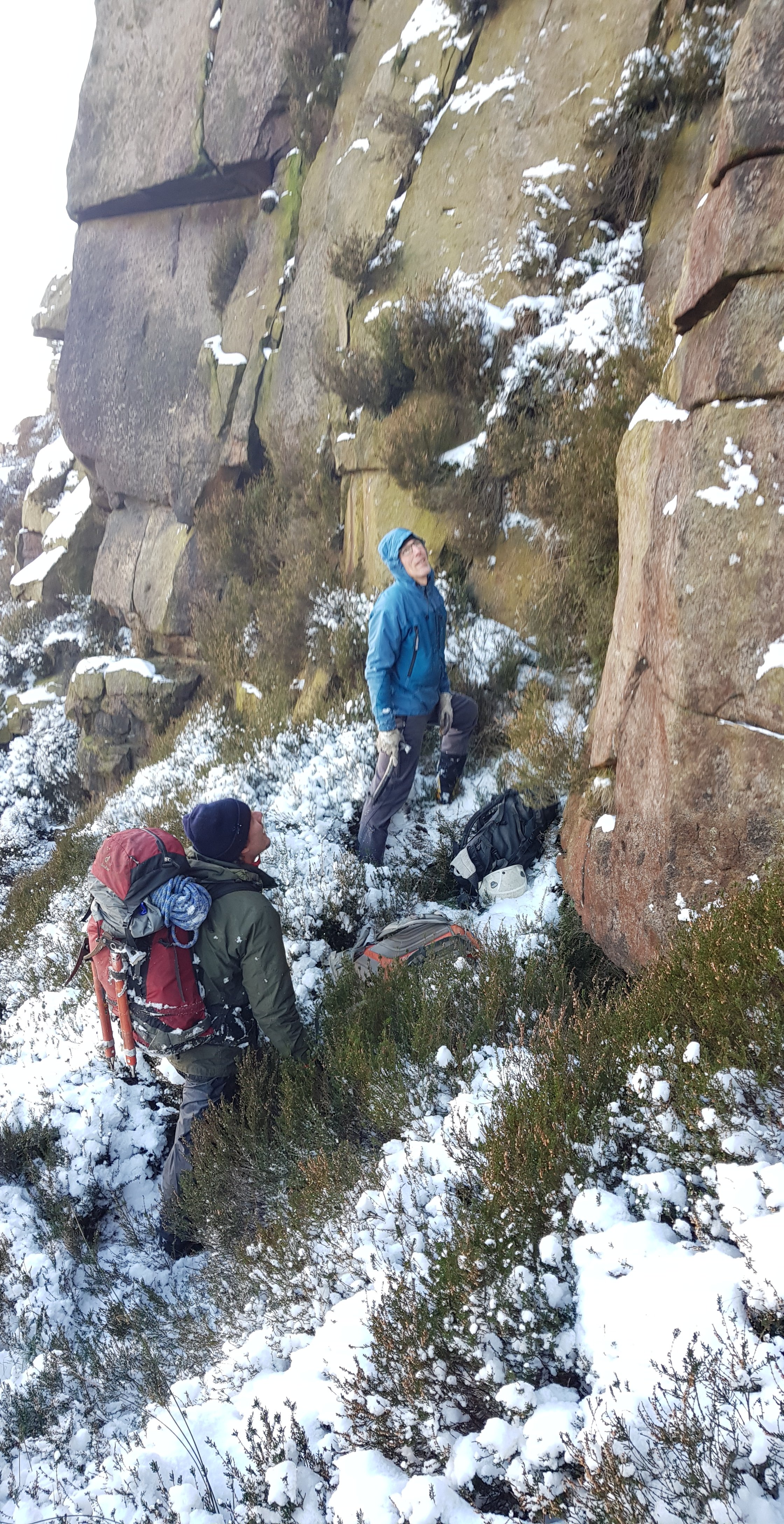 Heavy snow and subzero temperatures over the last few days – it’s certainly wintery, but would there be anything in condition. Andy’s optimism encouraged me and Tom along for the ride, with Doc along as official photographer. The first challenge was to get to the crag, through various construction obstacles