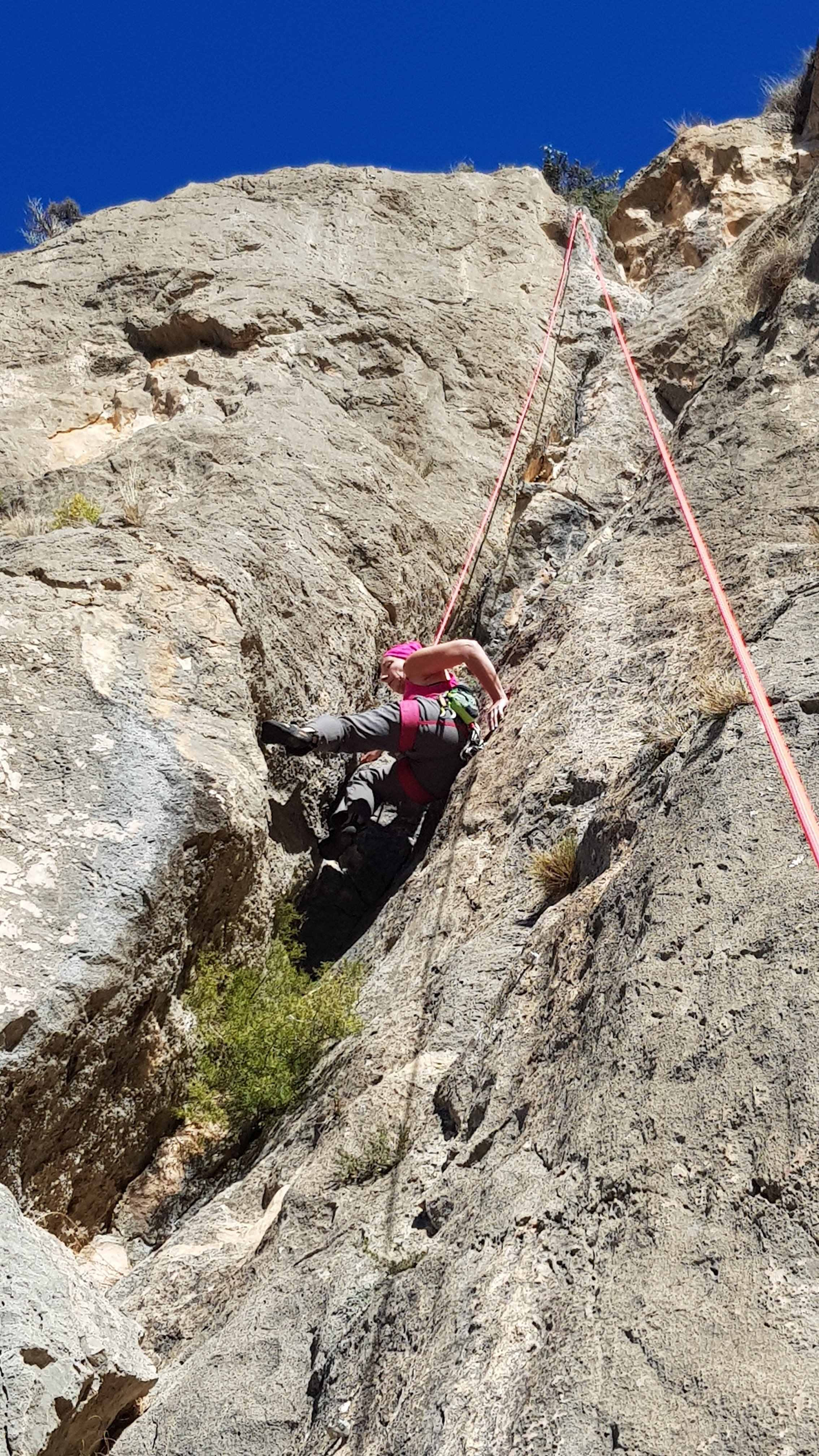 We caught up with Keith and Fiona; Jeff and Anne; and Andy and Pauline, so along with a few locals we had quite a crag full! We’d been armed with quite a few topos off the Internet, but they’re not always easy to read on a phone, which explains how we ended up warming up on a 6c thinking it was a 6a (a relief when Keith pointed out our error!) Helen top-roped the adjacent 6b up a corner, declaring it none too hard, but she did cheat by deploying traditional techniques…