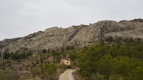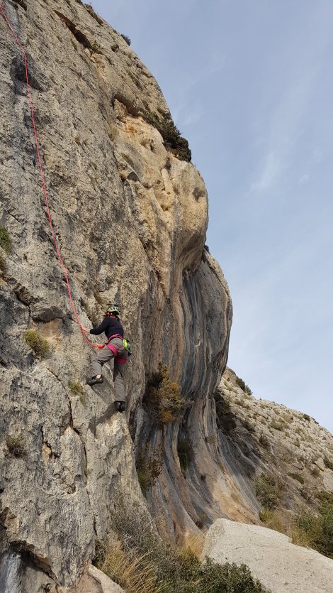 The Mas de la Penya crag above Cocentaina is one of our favourite discoveries of the last few years; striking diagonal lines on flaming orange rock, but you soon exhaust the routes below about 7b. On the same chunk of hillside, but a couple of km further right, sector Balconet proved to be much more amenable with about 50 routes mostly 5 through to 6c. Another tall (up to 40m) slabby wall with more natural lines than the crags around Busot, and perhaps more of a Provencale style – not that the weather matched, with a hazy day after so much wall-to-wall sunshine.