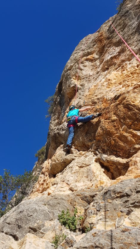 It turned out to be more like north west facing, and only really started coming into the sun around 2pm, with some sectors staying shady all day – including most of the easier lines. Eliminating a couple of thin and thuggy looking 6bs from our deliberations, we settled on Lacitos, 6b+, for our warm up, taking an orange-streaked wall up the tallest part of the crag – an outstanding route, though tough for the grade.