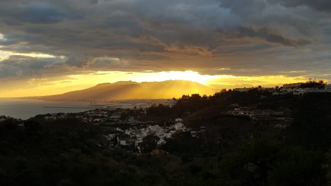 Great sunset over Malaga with the last of the sun’s rays slanting through low clouds