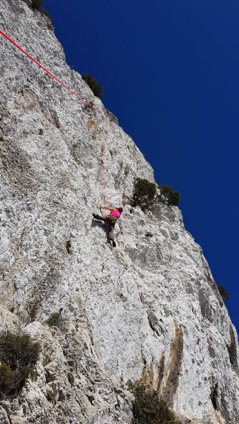 Our first foray is to the Azoia area and the Condominio sector. Park as indicated in the guide, then head down a dirt track to some dilapidated buildings surrounded by a barbwire fence; head down a steep path to the left of this, and as soon as the fence stops, cut back up and right passing a couple of ruined stone shacks to find the crag in less than ten minutes. It’s a strangely white lump of rock, about 25m high and leaning gently outwards, but with a profusion of flaky jugs to give a couple of dozen routes from 5+ to 7c, mostly 6a to 6c.