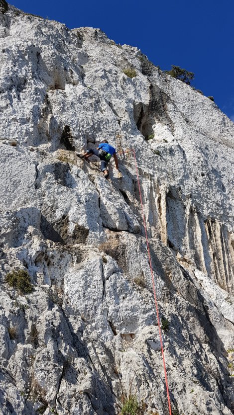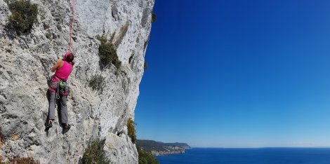Much of the coast here is protected by the Arrabida Natural Park, a wooded and craggy swathe of land that feels remarkably wild and unspoilt given it’s only 15 miles from the capital city. The area includes half a dozen climbing areas with limestone crags set above the sea or plunging down into it.
