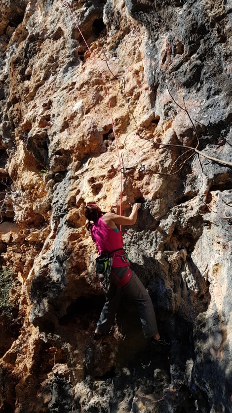 The crags of Fenda form a line above the bay, and from below they don’t look much. This is because, like an iceberg, you can only see the top fraction. Most of the climbing is hidden in a deep chasm giving a strangely subterranean feel to the place, and the “benefit” of shady belays in summer (not such a benefit in February though!)